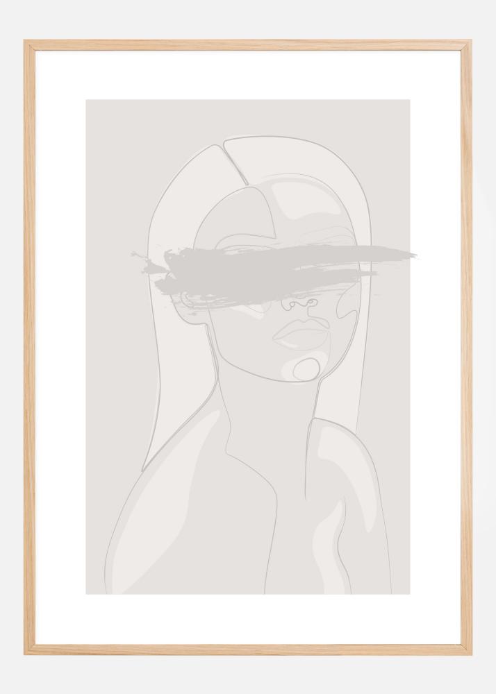 Ein abstraktes Poster einer Frau mit ausgeblendeten Augen. Dieses blassweiße und graue Werk zeigt den Kopf und die Schultern einer Frau in Blockformen und Linien. Ein Farbspritzer verdeckt die Augen und lässt die Frau geheimnisvoll erscheinen. Ein kräftiger weißer Rand umrahmt sie und eignet sich perfekt als Ergänzung zu einer einfarbigen Wand zu Hause.