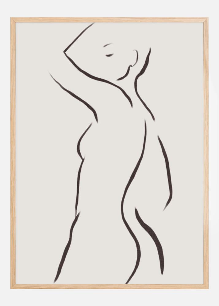 Das Poster zeigt die Linienzeichnung einer Frau, die sich nach oben streckt. Einfache Pinselstriche formen die fließende Form des Kopfes und des Oberkörpers dieser Frau, die stark und doch friedlich dasteht. Den Blick nach unten gerichtet, hebt sie ihren linken Arm hoch. Kombinieren Sie es mit einer hellen Wand, um die Linien hervorzuheben.