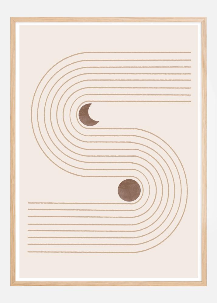 Dieses Poster bietet eine minimalistische Interpretation von böhmischen Formen und Himmelskörpern mit seinen geschwungenen Bögen und Linien, die ein harmonisches Muster bilden. Es verfügt über eine beruhigende Palette von erdigen Farbtönen, mit dunklen braunen Kreisen, die Monde oder Planeten darstellen können, was dem Design eine kosmische Note verleiht. Die Bögen vermitteln ein Gefühl von Bewegung und Fluss, während die runden Formen ein Element von Balance und Symmetrie hinzufügen.