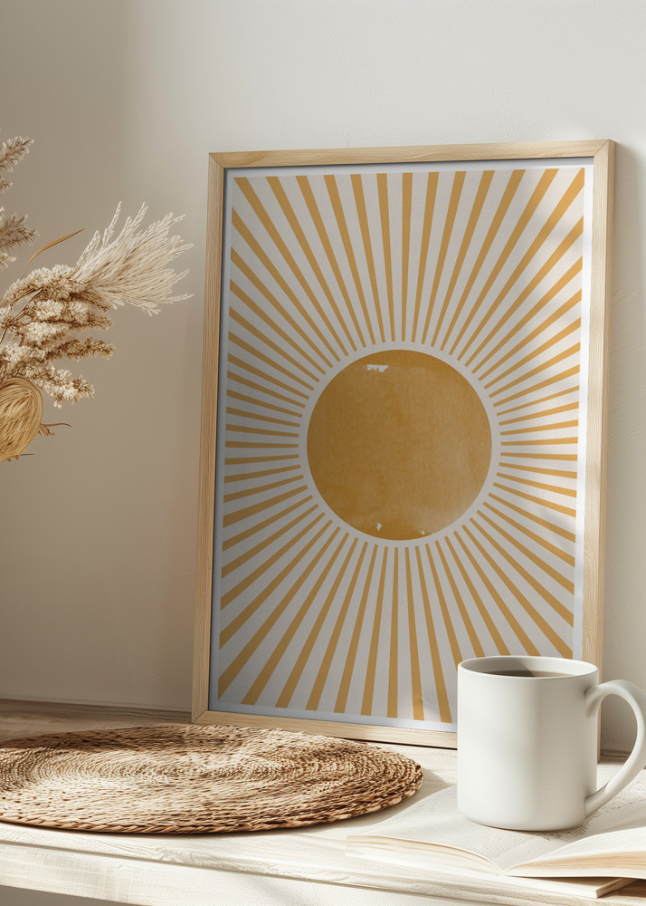 Dieser Druck kann jeden Raum aufhellen und einen Hauch von Boho-Chic in Ihre Einrichtung bringen. Er ist perfekt für diejenigen, die ein Stück der Schönheit der Natur und ein Gefühl von Licht in ihr Zuhause bringen möchten. Sein universelles Sonnensymbol macht ihn zu einer willkommenen Ergänzung in vielen verschiedenen Einrichtungsstilen, vom Wohnzimmer bis hin zu einem Yoga-Raum oder einem Kinderzimmer.