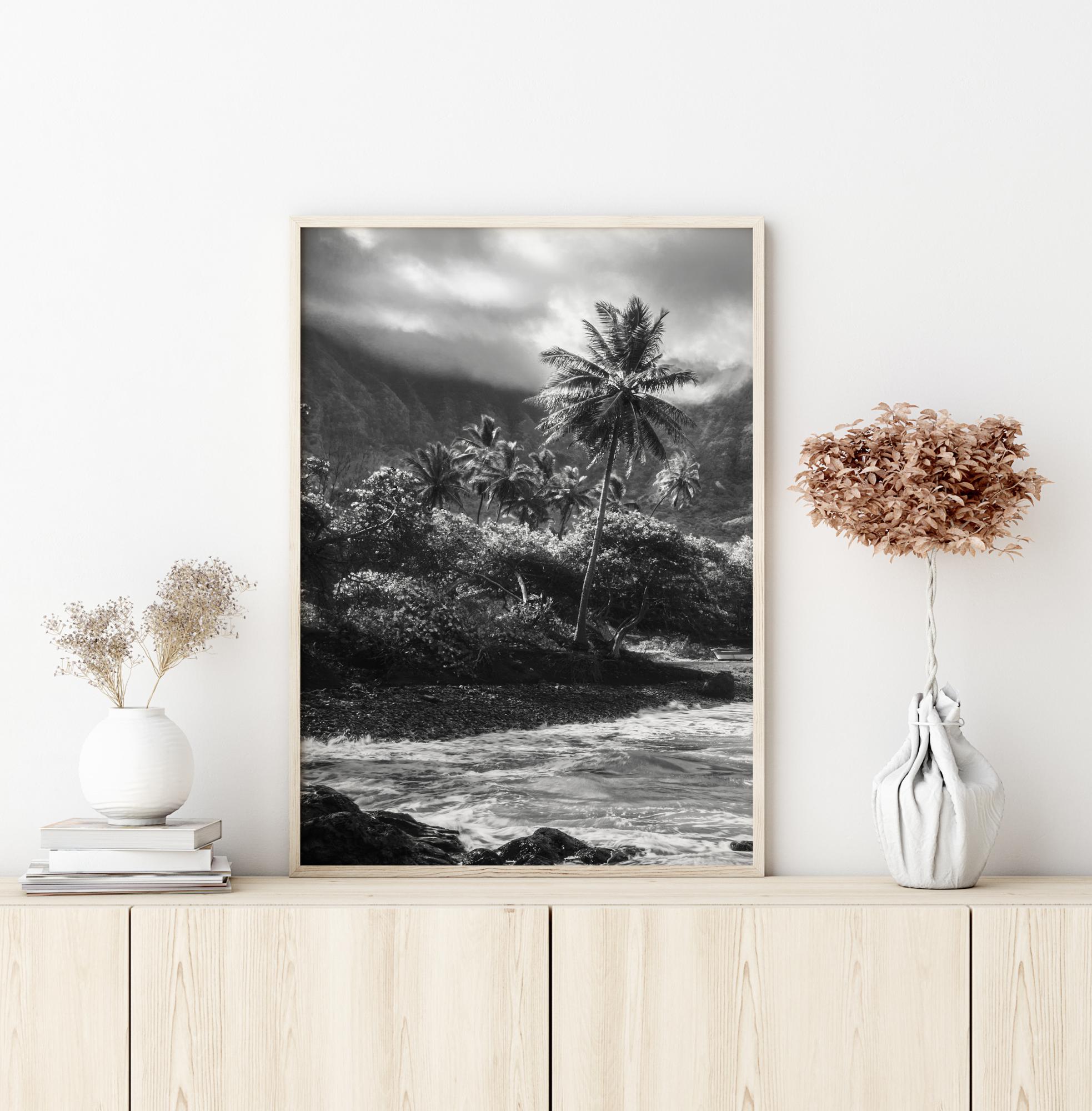 Ein Naturposter eines aufkommenden Sturms, bei dem das Meer auf Land trifft. Ein bedeckter Himmel verdunkelt das Foto, während sich die Palmen im Wind wiegen. Die schäumende See trifft auf die felsige Küste und sorgt für Aufregung. Bringen Sie Dramatik nach Hause, indem Sie diesen Schwarz-Weiß-Druck an einer neutralen Wand aufhängen.