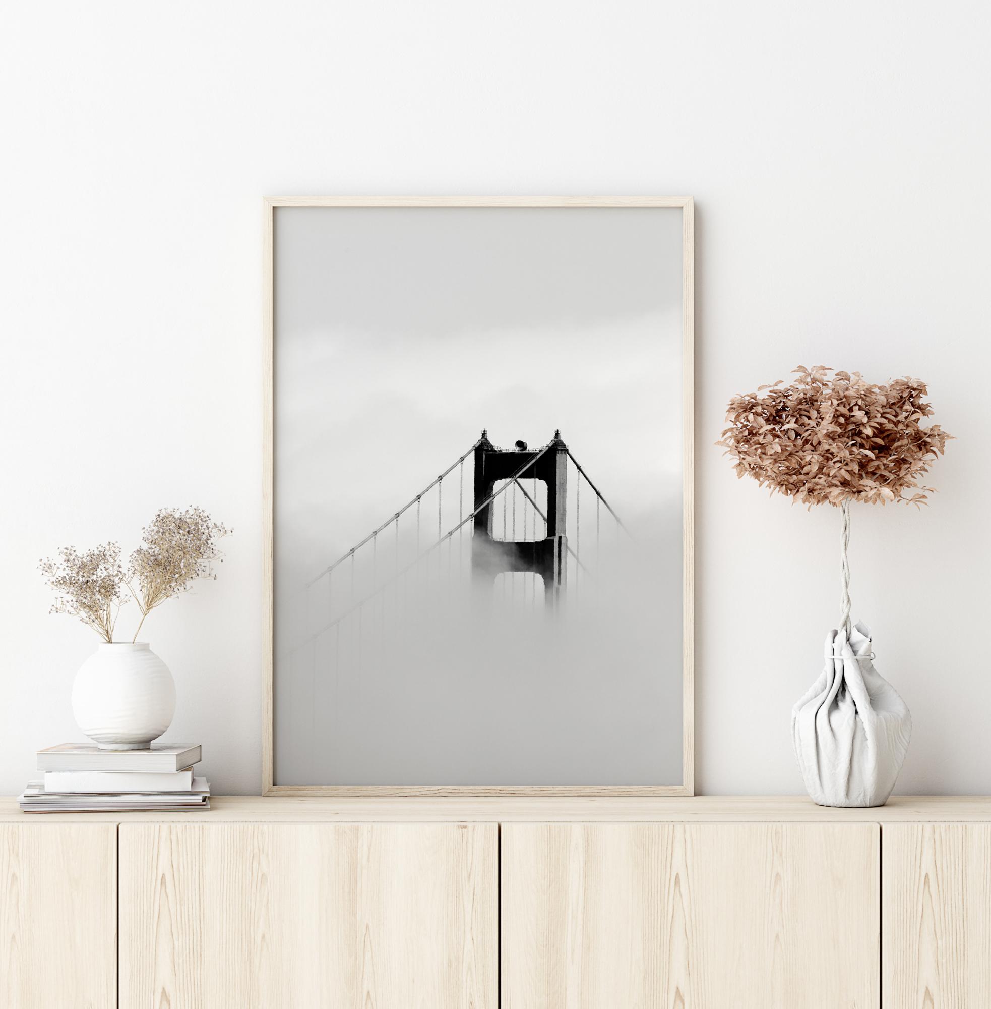 Ein dramatisches Poster von der Spitze einer Brücke. Nebel steigt auf und verdunkelt die gesamte Brücke mit Ausnahme der Spitze. Schwarz und massiv erhebt sie sich zwischen dem wolkenverhangenen Himmel darüber und dem Nebel darunter. Genießen Sie dieses atemberaubende Bild, wenn Sie dieses Poster mit nach Hause nehmen.