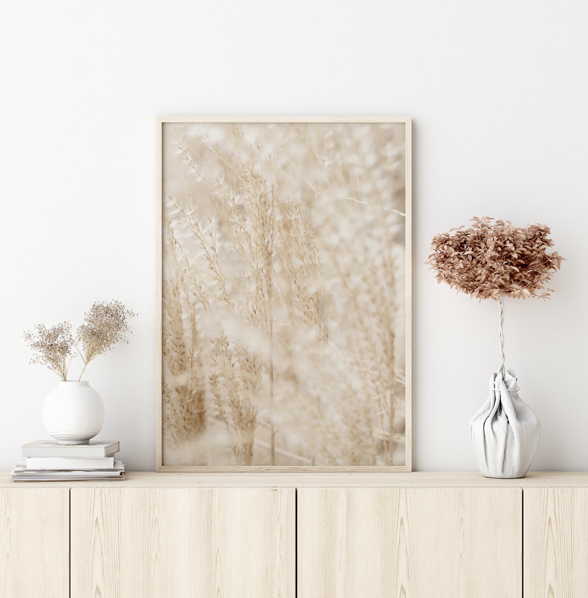 Ein sanftes, goldenes Poster eines Grasfeldes. Ein sanftes und entspannendes Bild von Weizengras, dessen weiche Spitzen in einem fast engelsgleichen weißen Lichtschein erstrahlen. Für etwas Friedliches und doch Ätherisches ist dies das perfekte Stück für eine kontrastreiche Wand zu Hause.