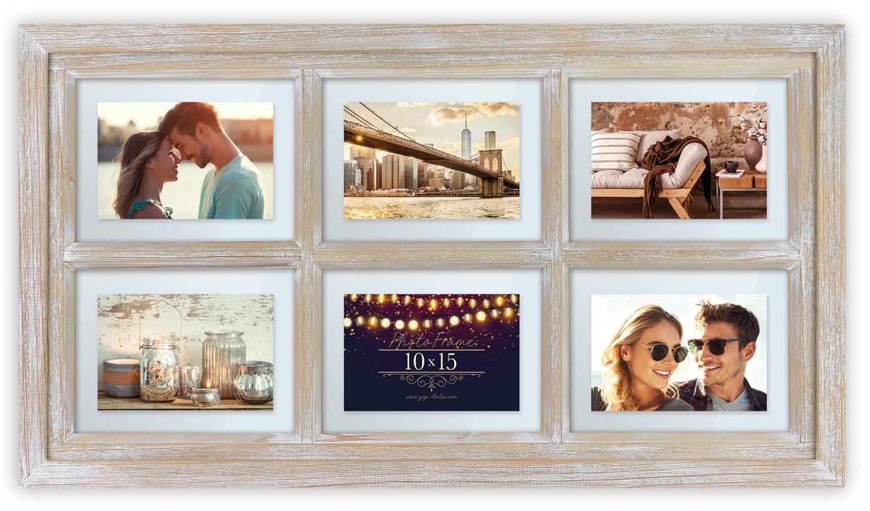 Collage-Bilderrahmen im Querformat, gefertigt aus hellem Holz. Dieser Collagerahmen setzt 6 Bilder im Format 10x15 cm wunderbar in Szene und ermöglicht eine hübsch angeordnete Bildercollage und damit eine schöne, persönliche Wanddekoration. Der Collagerahmen mit der feinen Holzmaserung wirkt natürlich, stilvoll und lässt sich wunderbar mit Vintage-Wohnaccessoires, Shabby-Chic, Landhausstil, modernen Wohnstilen sowie skandinavischem Einrichtungsstil kombinieren. Die Außenmaße des Collagerahmens betragen 38,5x69,5 cm. Der Collagerahmen ist mit einer Wandhalterung versehen.