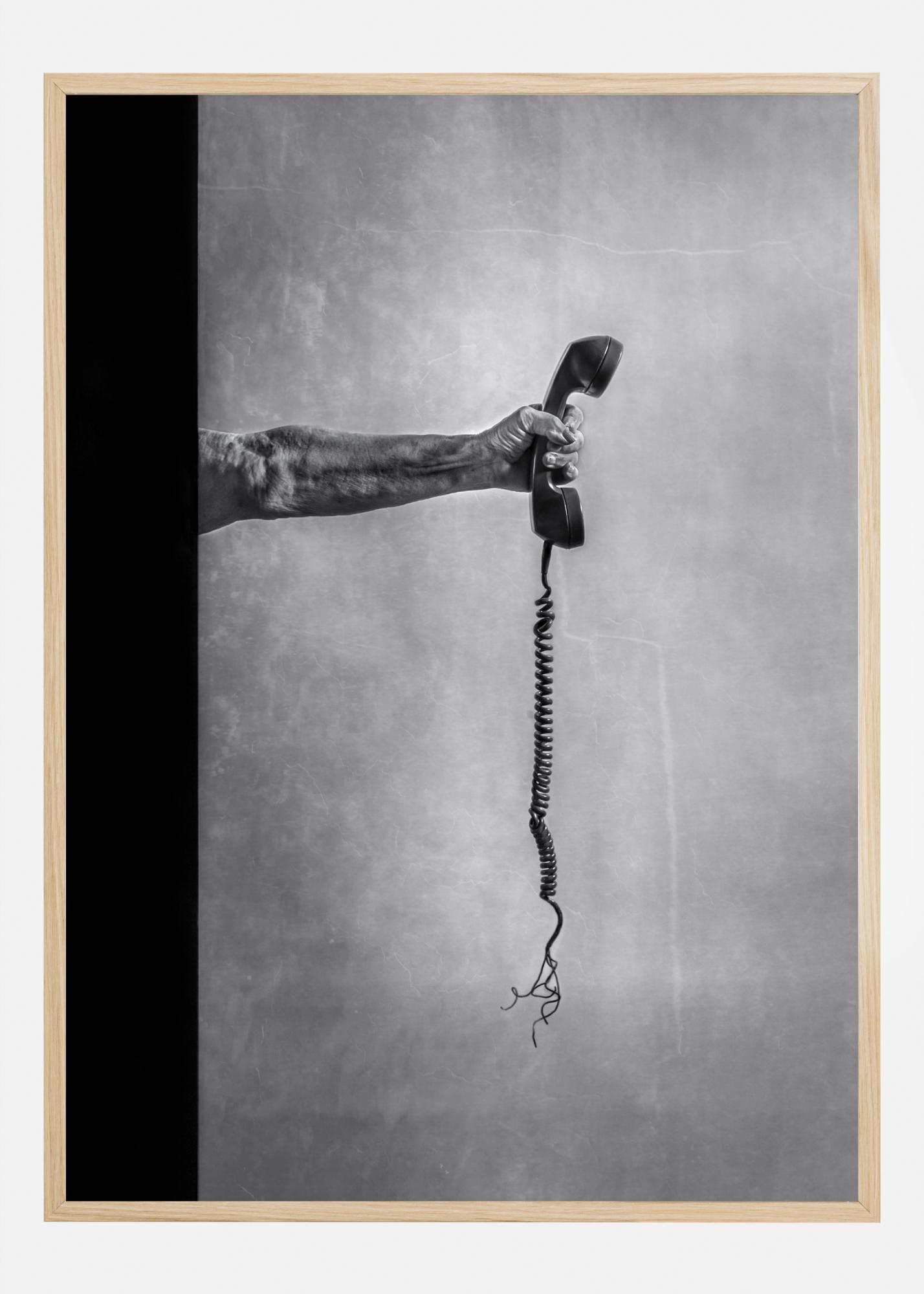 Ein Schwarz-Weiß-Poster mit einem Arm, der einen Telefonhörer mit abgeschnittenem Kabel hält. Der starke Arm hält das Telefon in die Mitte des Posters. Das schwarze Telefon und das Kabel hängen vor einem grauen Hintergrund herab. Wem wird das Telefon hingehalten? Entspannen Sie sich und betrachten Sie dieses Bild zu Hause.