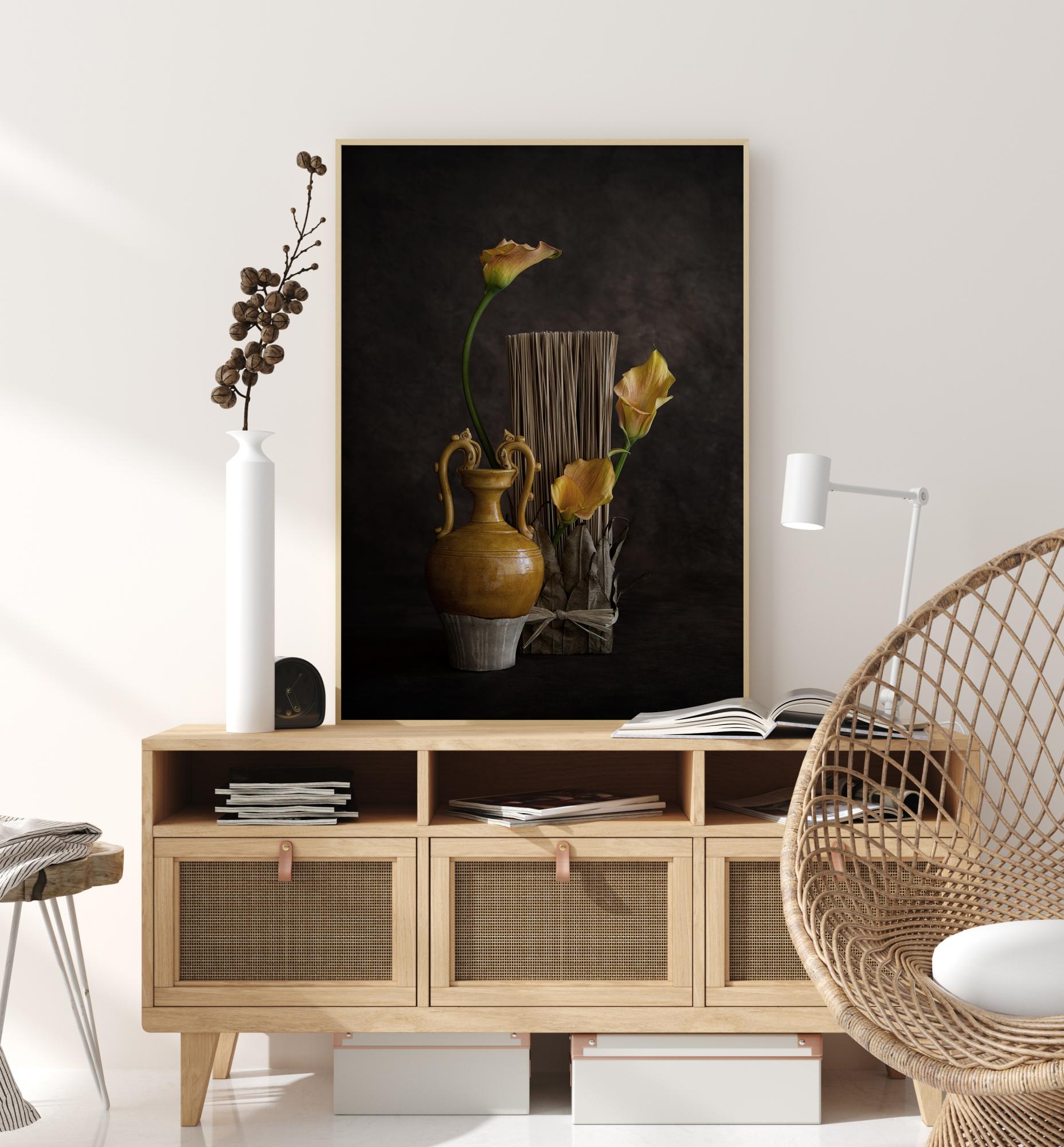 Ein Stillleben-Poster mit einem Krug, getrockneten braunen Stängeln und drei Calla-Lilienblüten. Ein schwarzer Hintergrund lässt den senffarbenen Krug und die drei gelben Lilien stark hervortreten. Eine Lilie wölbt sich nach oben und zieht den Blick auf das Werk. Bringen Sie damit einen Hauch von Eleganz in Ihr Zuhause.