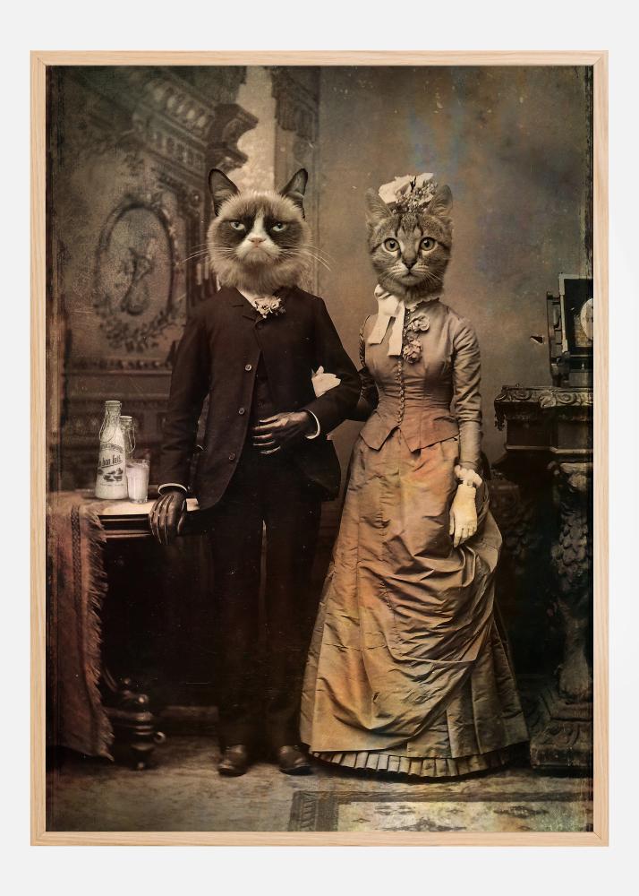 Ein witziges Poster mit einem Katzenpaar in viktorianischer Kleidung. Grumpy Cat und seine Braut stehen in viktorianischer Kleidung mit Anzug und Korsett auf diesem Sepia-Druck. Bringen Sie Ihr Haus zum Lachen, wenn Sie dieses Poster an Ihre Wohnzimmerwand hängen.