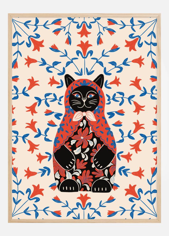 Dieses farbenfrohe und lebendige Poster ist eine moderne Interpretation der klassischen russischen Matroschka, neu vorgestellt als majestätische Katzenfigur, die im Zentrum auf einem üppigen Blumengarten sitzt. Der Blick der Katze ist durchdringend und mysteriös, während ihr Fell reich mit komplizierten Blumendesigns verziert ist. Rund um die Katze breitet sich ein Meer aus roten und blauen Blumen auf einem cremefarbenen Hintergrund aus, was ein fast hypnotisierendes Muster ergibt, das sowohl fesselnd als auch schön ist.