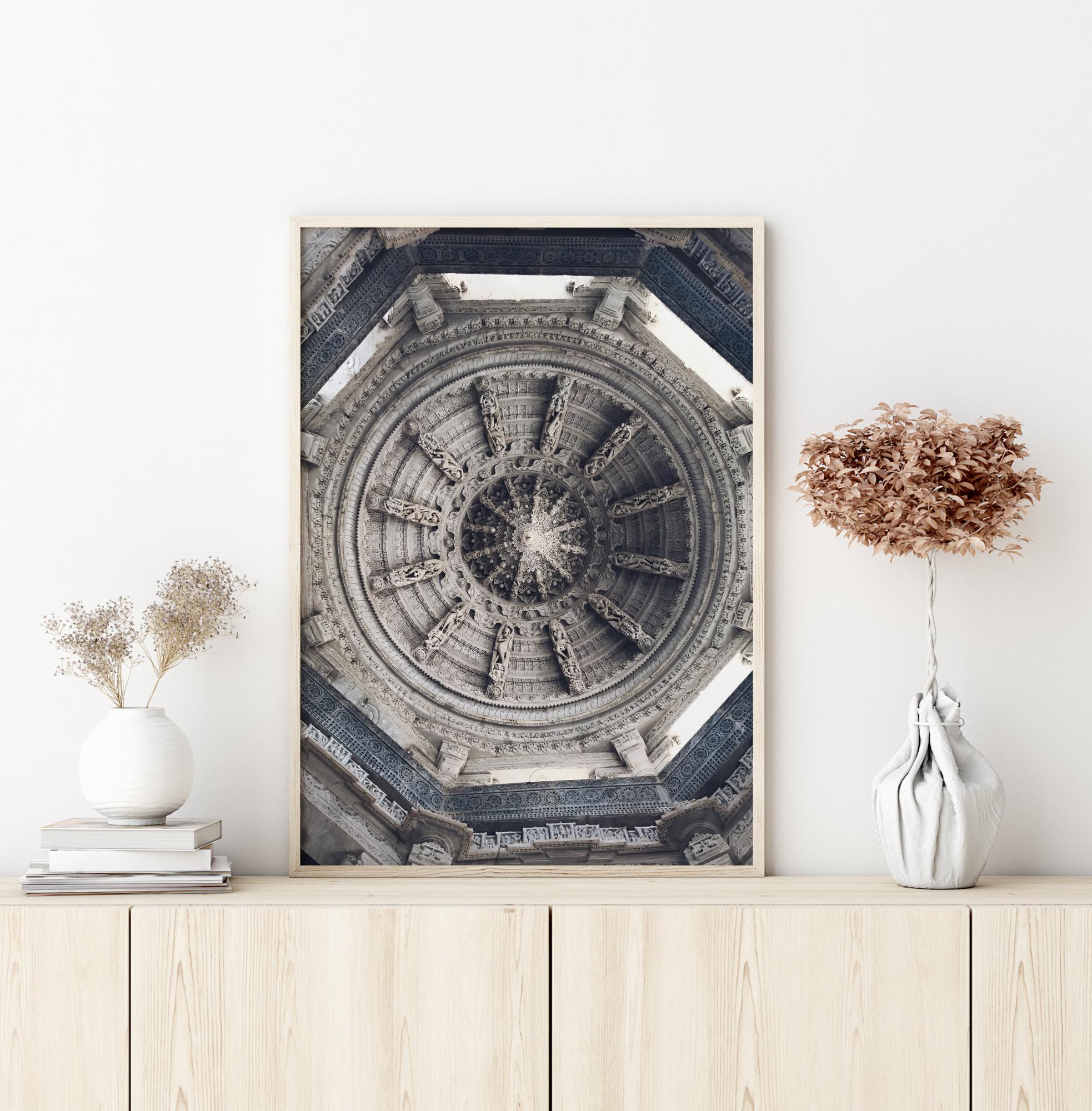 Ein schwarz-weißes Poster einer steingrauen Decke. Die Decke ist mit Kreisen gestaltet und sieht aus wie ein Schiffsrad. Sie ist von einem Achteck umgeben und weist überall geometrische Formen auf. Bringen Sie mit diesem Deckenposter Leben an eine zartblaue Wand.