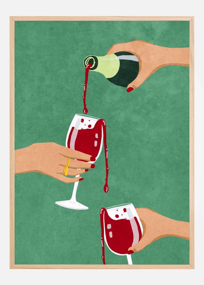 Die Farben dieses Posters sind warm und einladend, mit einer reichen roten Nuance, die den Wein ausmacht, ergänzt durch die Hauttöne und den grünen Hintergrund, die Tiefe und Kontrast hinzufügen. Diese Farbkombination macht das Bild zu einem exquisiten Einrichtungselement, das die Atmosphäre in jedem Raum erwärmen kann. Das Poster ist von einem Holzrahmen umgeben (der Rahmen ist nicht im Motiv enthalten), der das warme und einladende Gefühl, das das Bild vermittelt, verstärkt. Ein perfekter Kauf für Weinliebhaber oder als Geschenk für einen Freund, der Kunst und gute Momente gemeinsam schätzt.