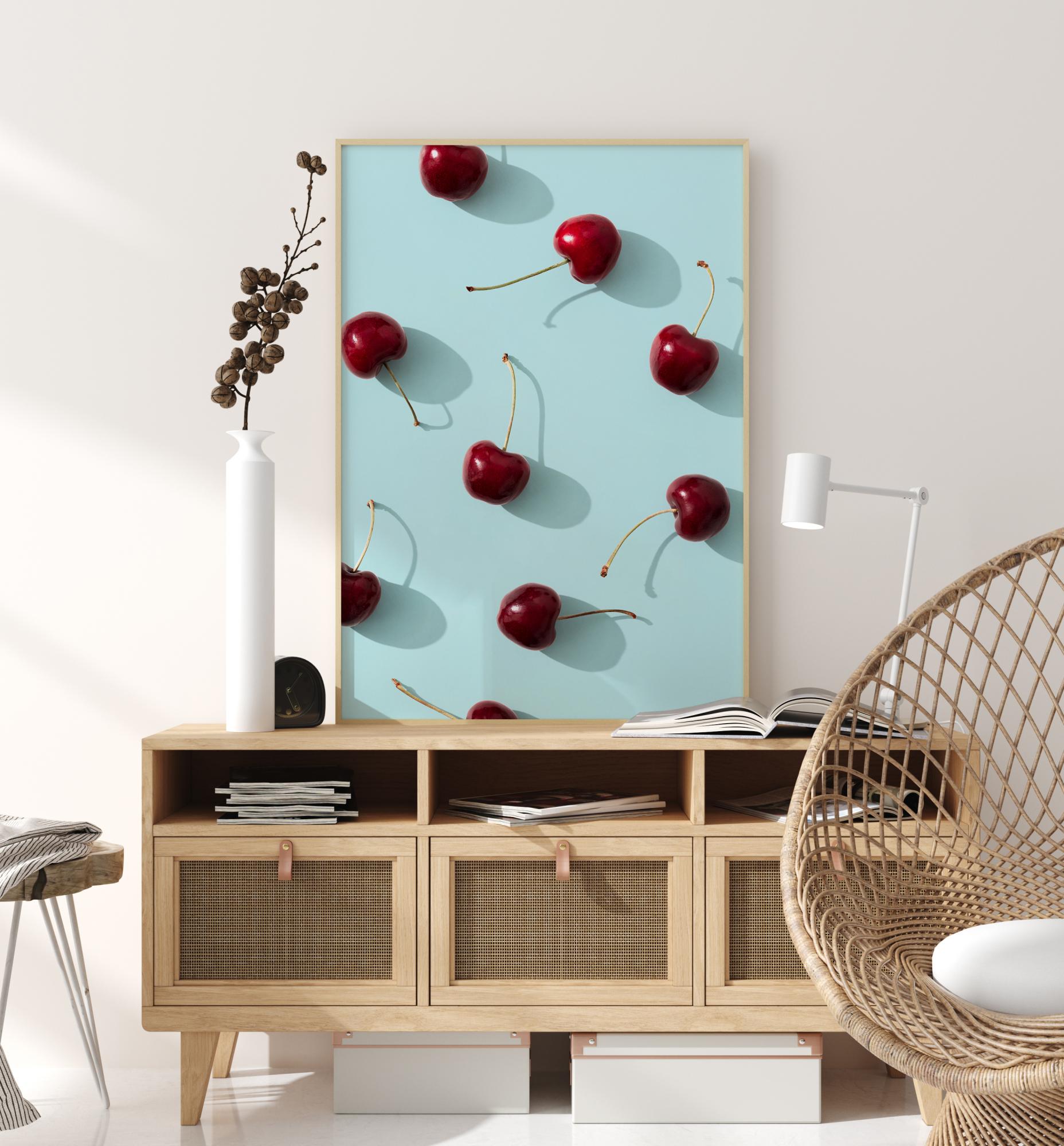 Ein Obstposter mit acht Kirschen auf einem sanften blauen Hintergrund. Die leuchtend roten Kirschen und ihre Stiele werfen Schatten auf die einfache türkisfarbene Tischplatte, auf der sie liegen. Erinnern Sie sich selbst an Ihre fünf am Tag, wenn Sie dieses saftige Bild in Ihrer Küche aufhängen.