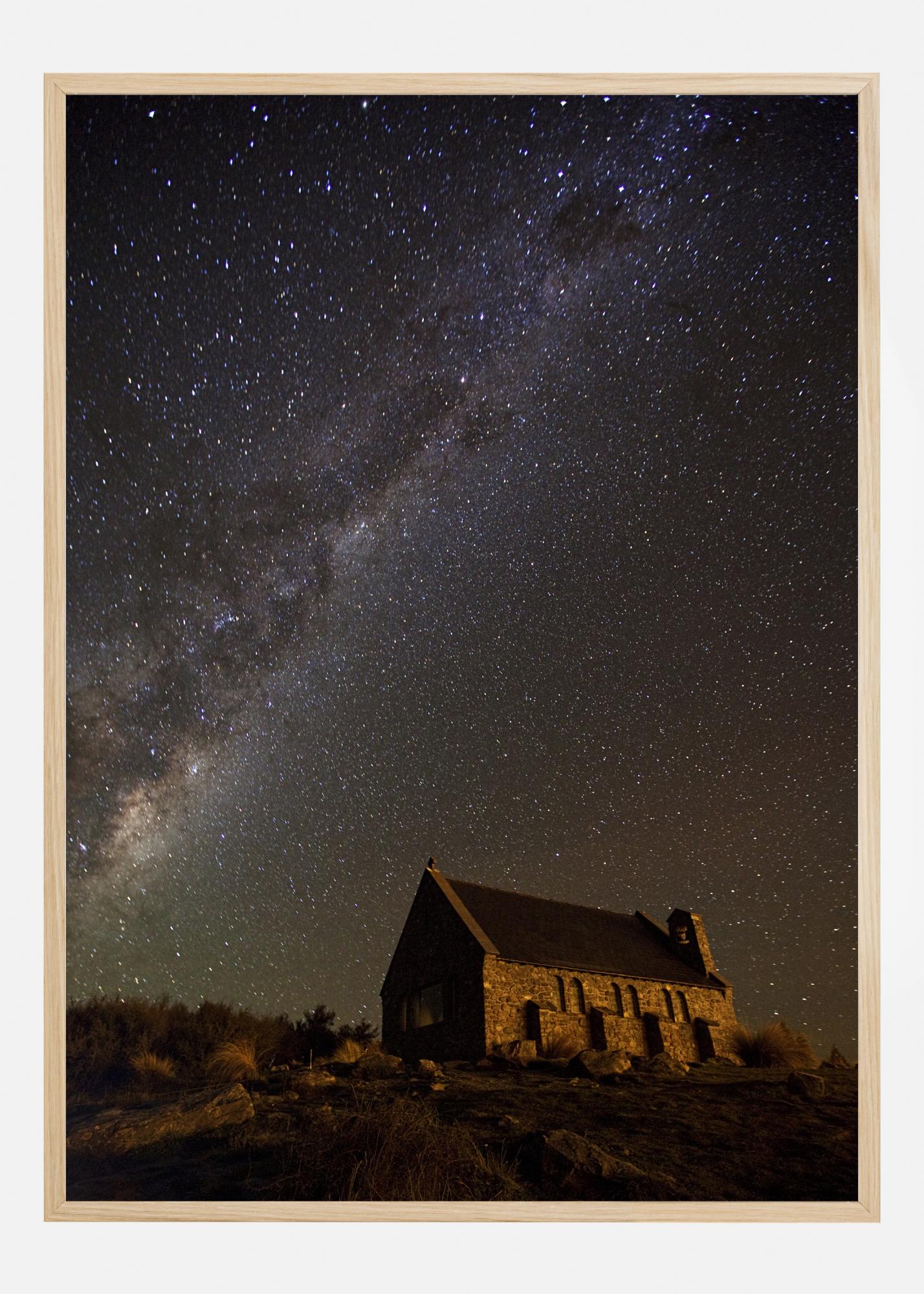 Ein religiöses Poster einer alten Steinkirche vor der Kulisse der Milchstraße. Die rustikale Kirche auf einer sanften Hügelkuppe ist mit zartem orangefarbenem Licht beleuchtet. Der helle Nachthimmel ist mit winzigen, stecknadelkopfgroßen Sternen gefüllt, während sich die Galaxie über dem Gebäude windet. Spüren Sie die Ehrfurcht vor unserem Universum in diesem Bild.