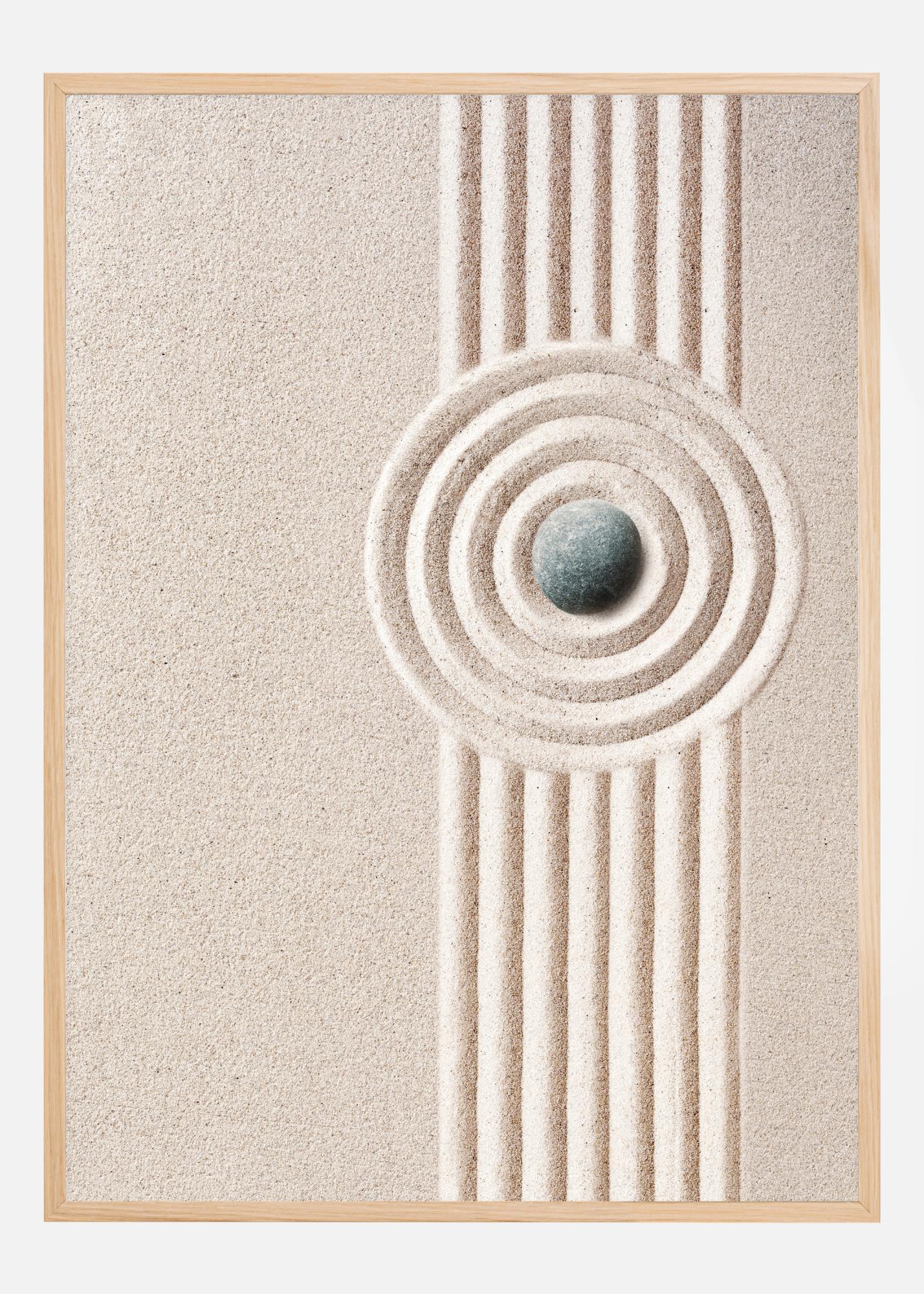 Ein geometrisches Poster mit Sandformen. Sieben vertikale Linien sind in den Sand gezeichnet, die von einem sorgfältigen Fünfringkreis durchschnitten werden. In der Mitte liegt ein einzelner blau-grauer Stein. Bestaunen Sie die Perfektion dieses eleganten Posters mit geometrischen Formen.