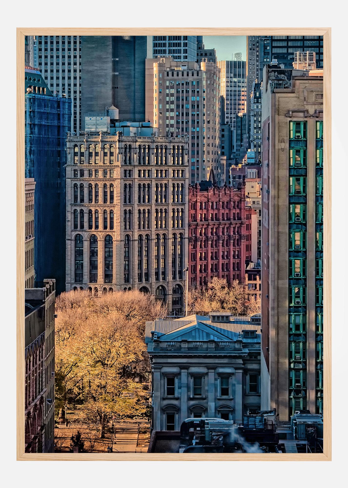 Ein Poster mit einer städtischen Landschaft, auf dem alte und neue Gebäude nebeneinander stehen. Herbstliche Bäume und rote Backsteingebäude bilden einen atemberaubenden Kontrast zu den kalten Blautönen der Wolkenkratzer. Stellen Sie sich vor, Sie blicken aus Ihrem Fenster auf diese geschäftige Stadtszene, wenn Sie dieses Poster mit nach Hause nehmen.