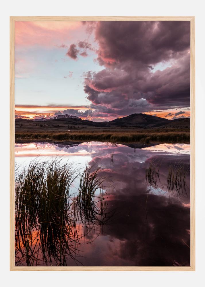 Ein Landschaftsposter eines Sees mit Schilf und atemberaubenden Wolken am Horizont. Das Schilf wiegt sich im See im Wind, während große violette Wolken über den See ziehen, die sich in der ruhigen Seeoberfläche spiegeln. Zwei Wolkenlinien lenken den Blick auf den Horizont und den rötlichen Farbton der untergehenden Sonne. Genießen Sie die Dramatik dieses in kräftigen Pastelltönen gehaltenen Bildes.