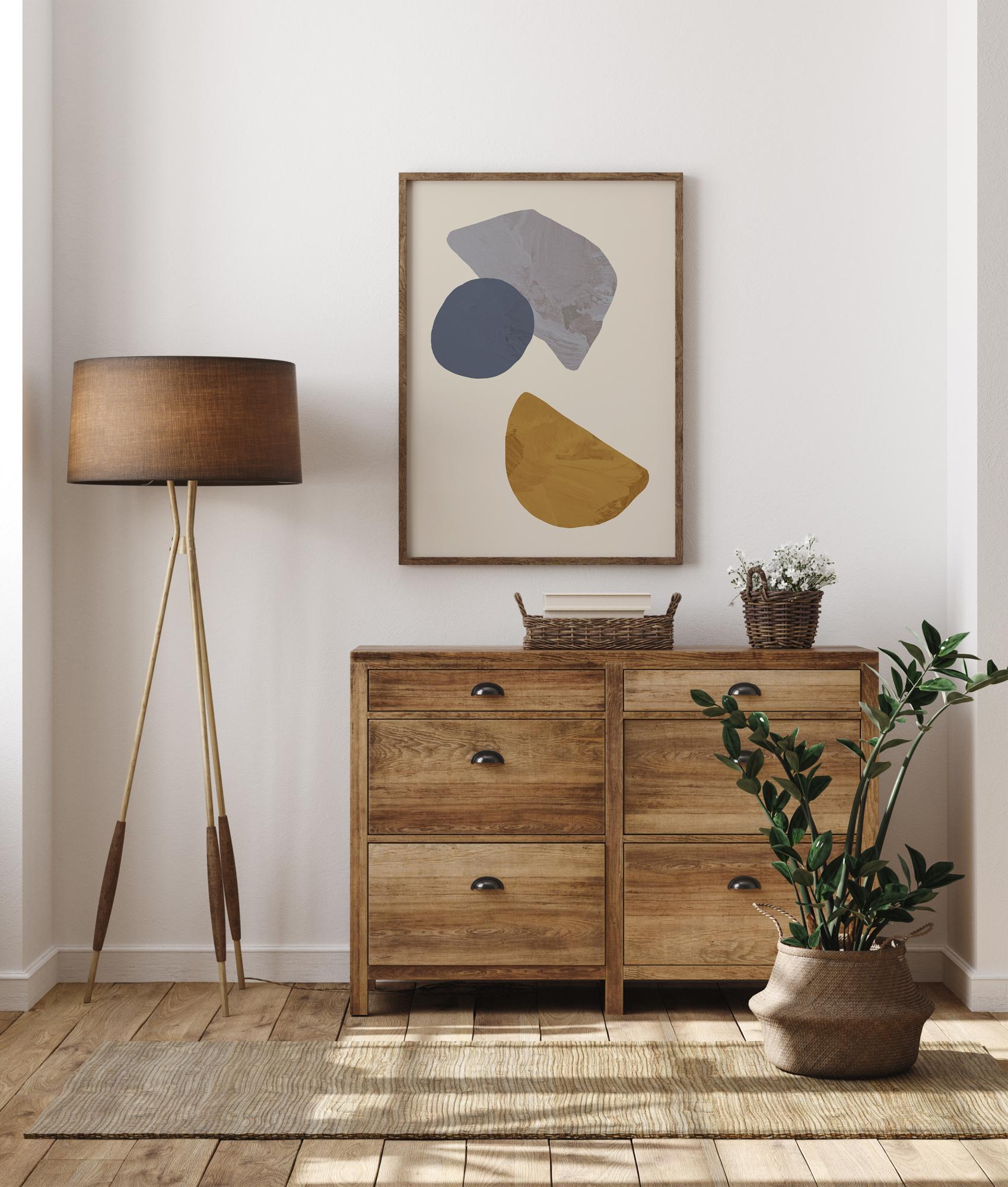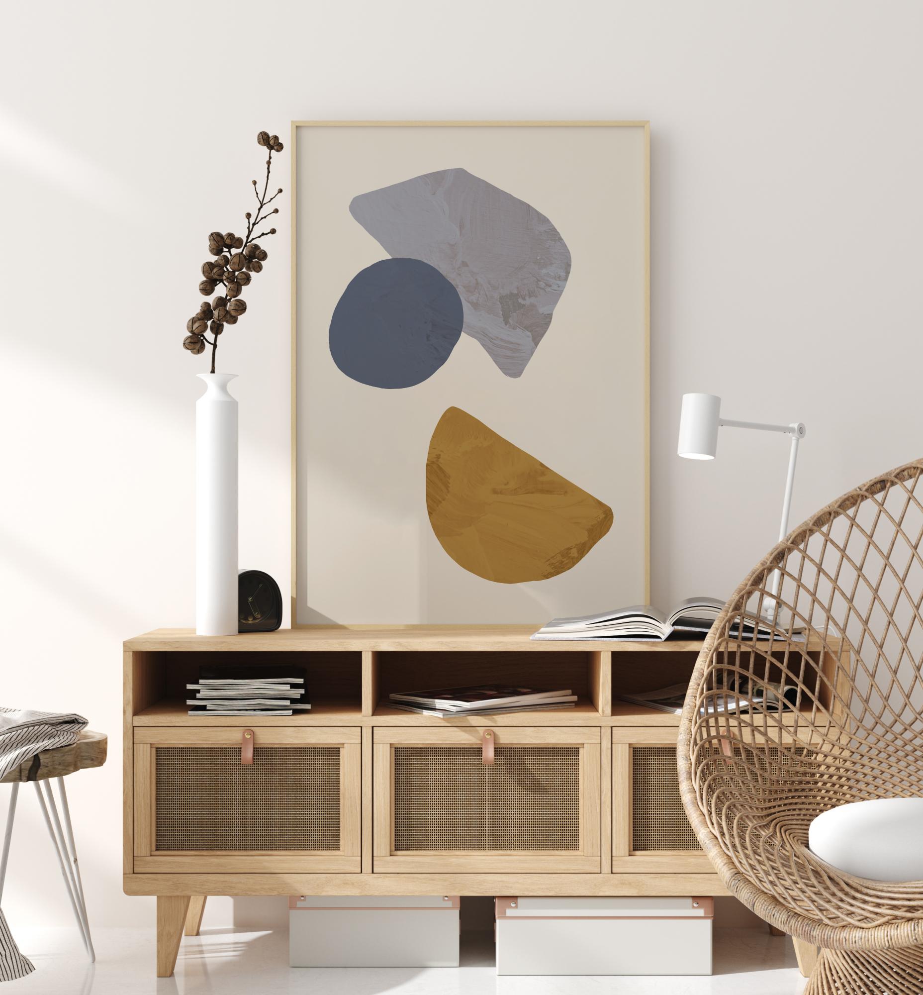 Ein abstraktes Poster mit drei verschiedenen Formen und Farben. Ein brauner Halbkreis befindet sich in der unteren Hälfte mit einem hellblauen Balken in der Mitte des Bildes. Darüber befindet sich ein dunkelgrauer Halbkreis, alles auf weißem Hintergrund. An einer schlichten Wand sorgt dieses Poster für Gesprächsstoff.