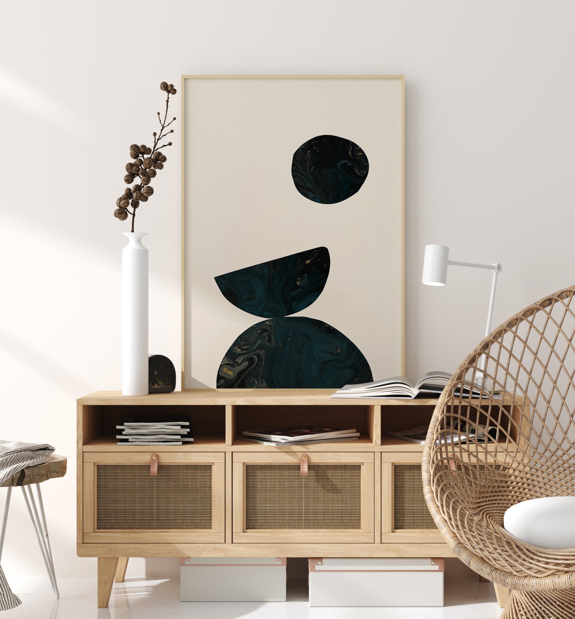 Ein helles Poster mit drei dunkelblauen und schwarzen Formen, die ein faszinierendes Bild ergeben. Ein Halbkreis sitzt am unteren Rand und balanciert einen anderen nach oben gedrehten Halbkreis aus. Darüber schwebt ein schwarzer Kreis auf einem auffälligen weißen Hintergrund. Kombinieren Sie die schönen Marmorwirbel mit einem helleren Farbton an den Wänden, um die Wirkung zu verstärken.