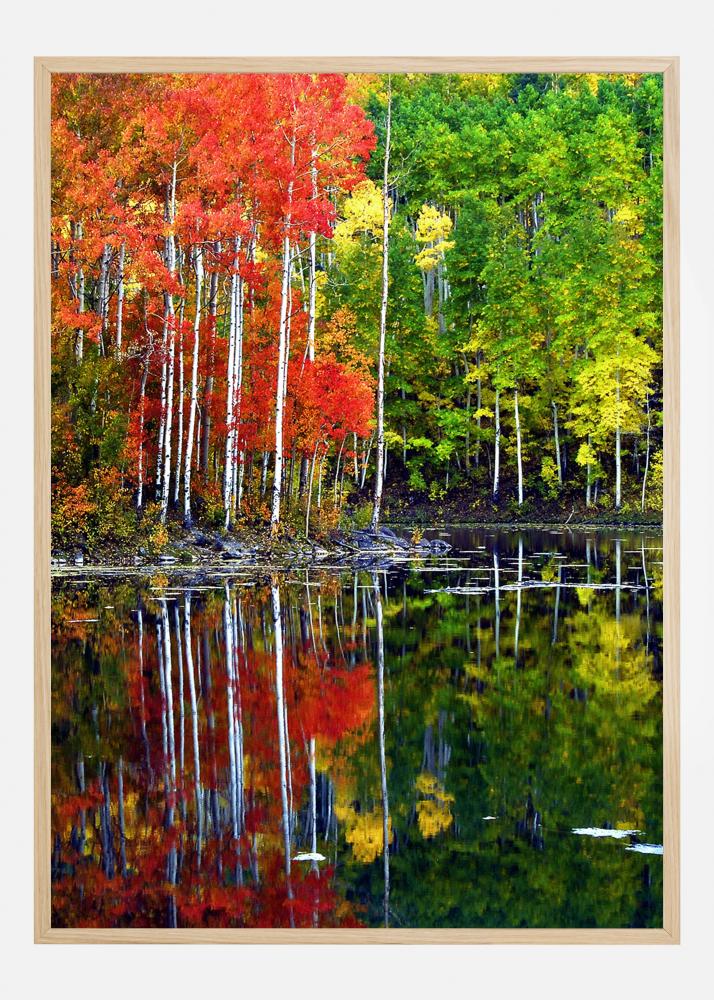 Ein leuchtendes Poster eines von Bäumen umgebenen Sees. Frühling und Herbst treffen in diesem farbenfrohen Bild aufeinander, mit roten Blättern auf der linken und grünen auf der rechten Seite. Alle spiegeln sich im See in einer ruhigen, aber farbenfrohen Szene wider. Holen Sie sich mit diesem Druck die Freude an der Natur in Ihr Zuhause.