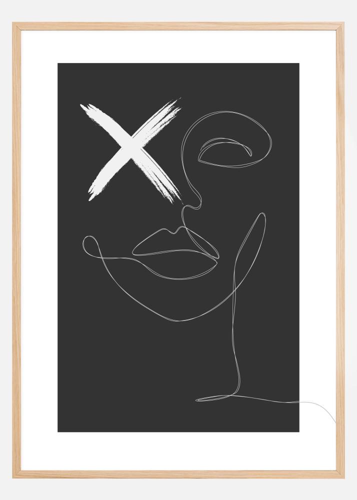 Ein abstraktes Poster mit einem Gesicht in dünnen weißen Linien auf schwarzem Hintergrund. Die weißen Linien sind alle miteinander verbunden und bilden das Gesicht in einer einzigen fließenden Bewegung. An der Stelle, wo ein Auge sein sollte, befindet sich ein dramatisches weißes Kreuz. Was soll das bedeuten? Hängen Sie es auf, um zu Hause über Kunst zu sprechen.