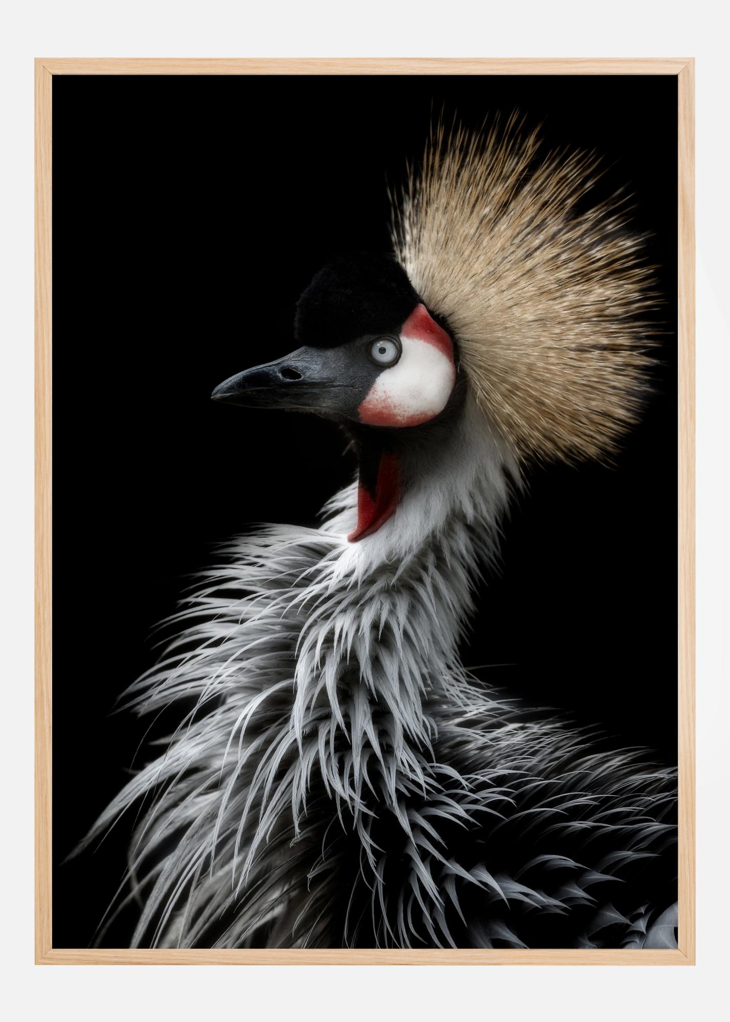 Ein atemberaubendes Wildtierposter mit einem Kronenkranich auf schwarzem Hintergrund. Die weißen Federn und der flauschige gelbe Kamm heben sich dramatisch ab und sorgen für einen königlichen Effekt. Die roten und weißen Muster ziehen den Blick auf den Vogel. Bewundern Sie die Großartigkeit der Tierwelt in diesem atemberaubenden Vogelporträt.