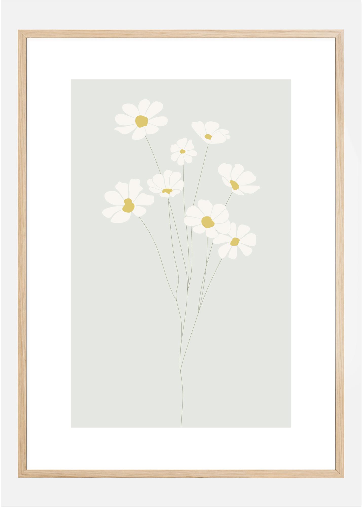 Ein subtiles Poster eines Gänseblümchendrucks mit einem zarten Look. Die schlichten weißen und gelben Blüten recken sich auf schlanken Stielen in die Höhe und sind auf einem sanften, hellblauen Hintergrund zu sehen. Fügen Sie dieses Poster Ihrem Kinderzimmer hinzu, um eine sanfte, aber niedliche Atmosphäre für die Kinder zu schaffen.
