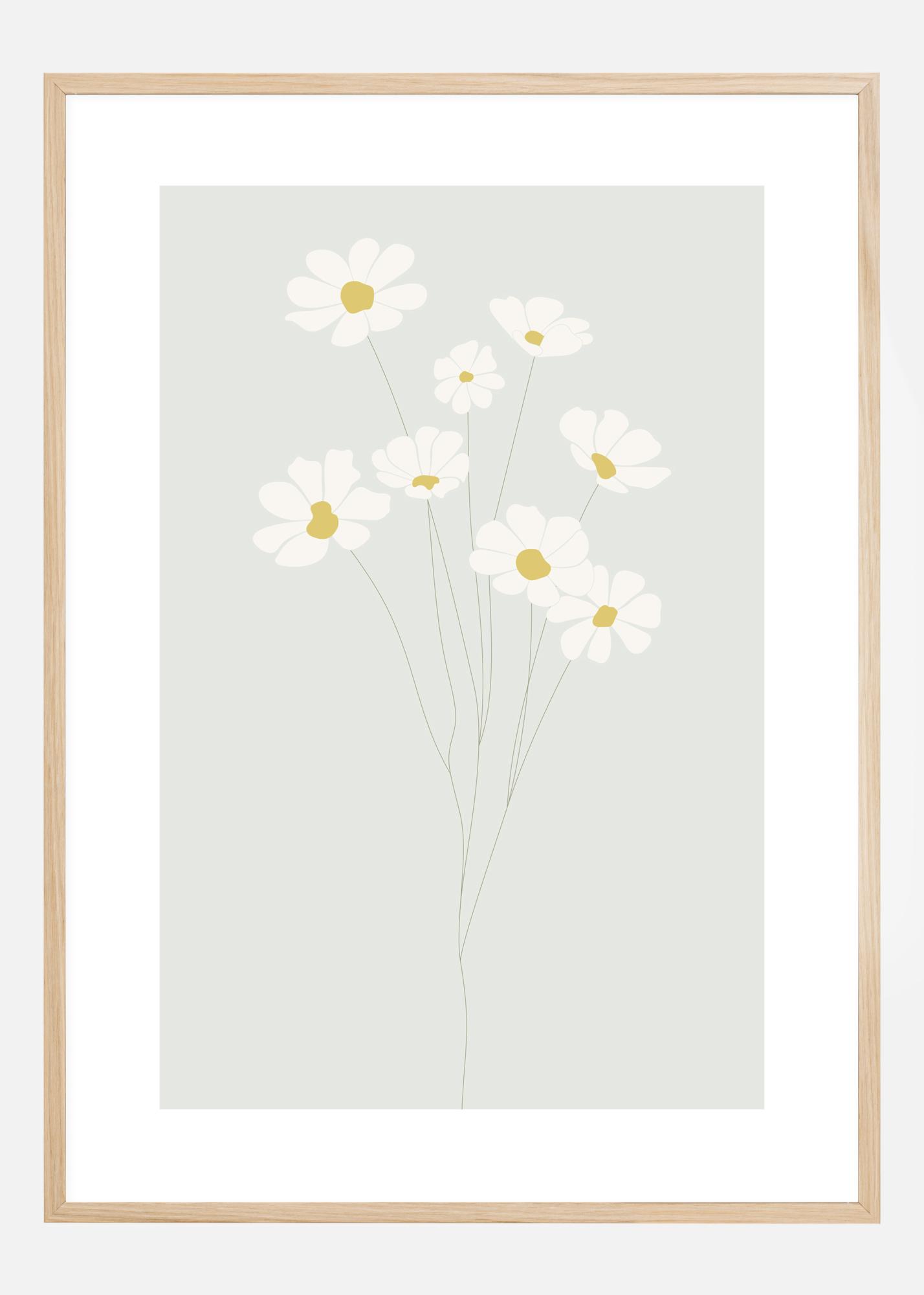 Ein subtiles Poster eines Gänseblümchendrucks mit einem zarten Look. Die schlichten weißen und gelben Blüten recken sich auf schlanken Stielen in die Höhe und sind auf einem sanften, hellblauen Hintergrund zu sehen. Fügen Sie dieses Poster Ihrem Kinderzimmer hinzu, um eine sanfte, aber niedliche Atmosphäre für die Kinder zu schaffen.