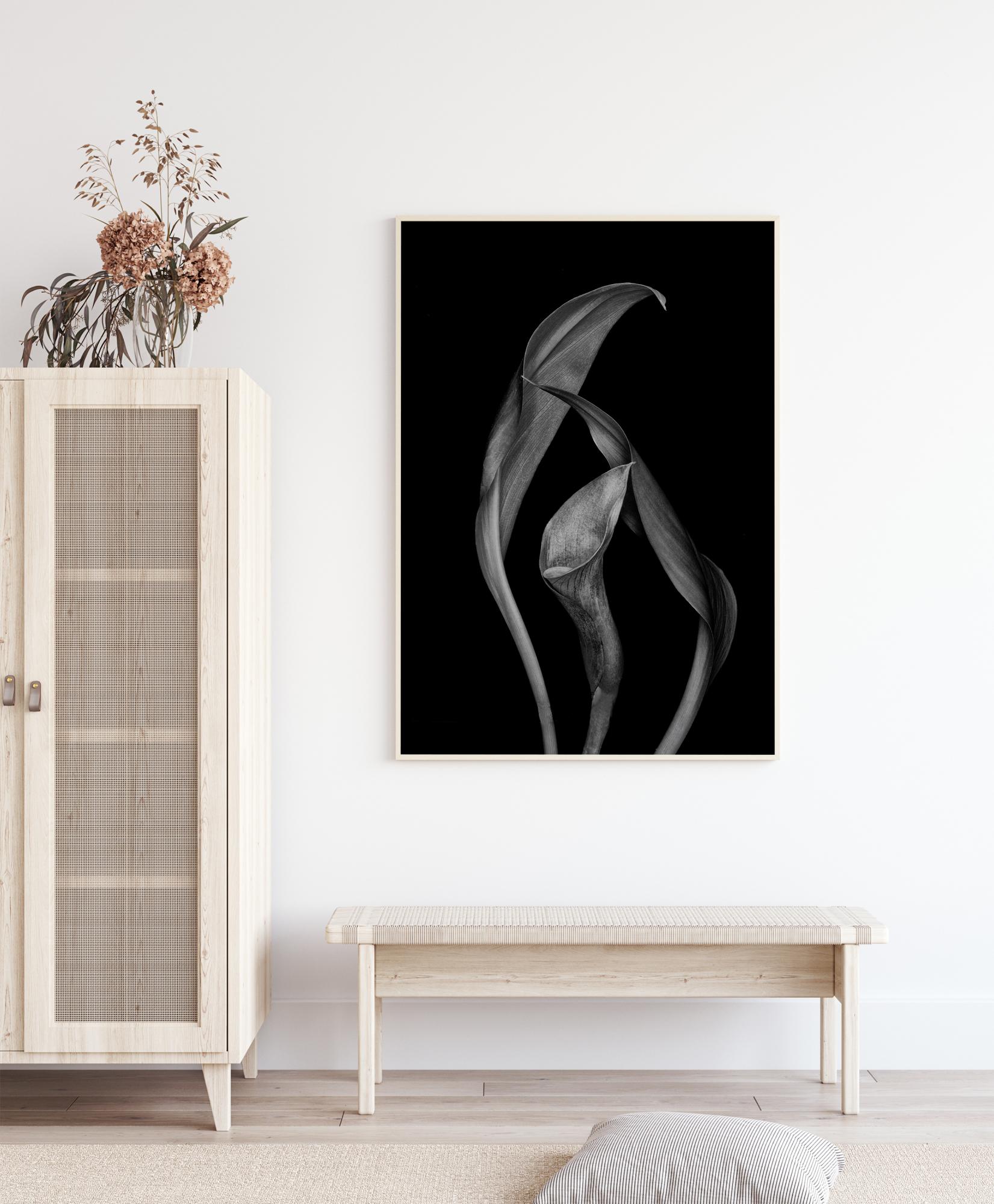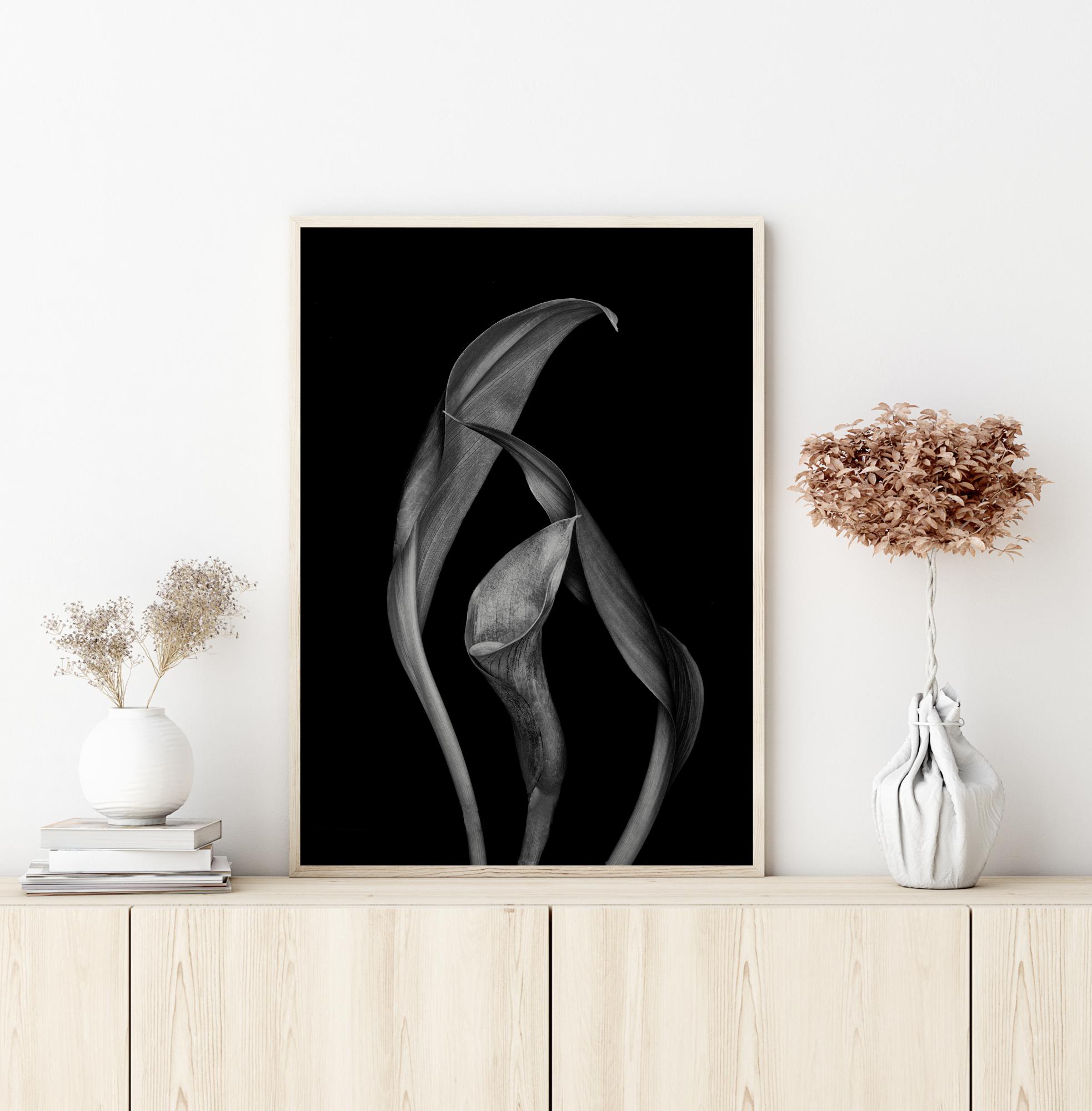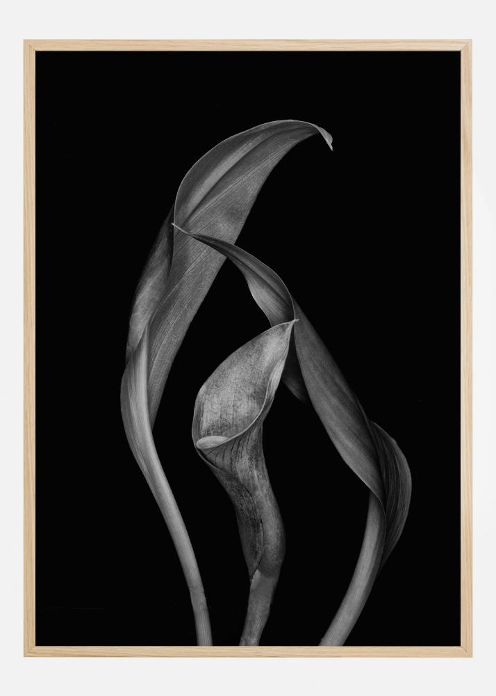 Ein ungewöhnliches Poster mit tanzenden Calla-Lilien vor einem scharfen schwarzen Hintergrund. Bringen Sie etwas Dramatik in Ihr Zuhause mit dieser fremdartigen, aber fesselnden Naturaufnahme, die jeden, der sie sieht, inspirieren wird.