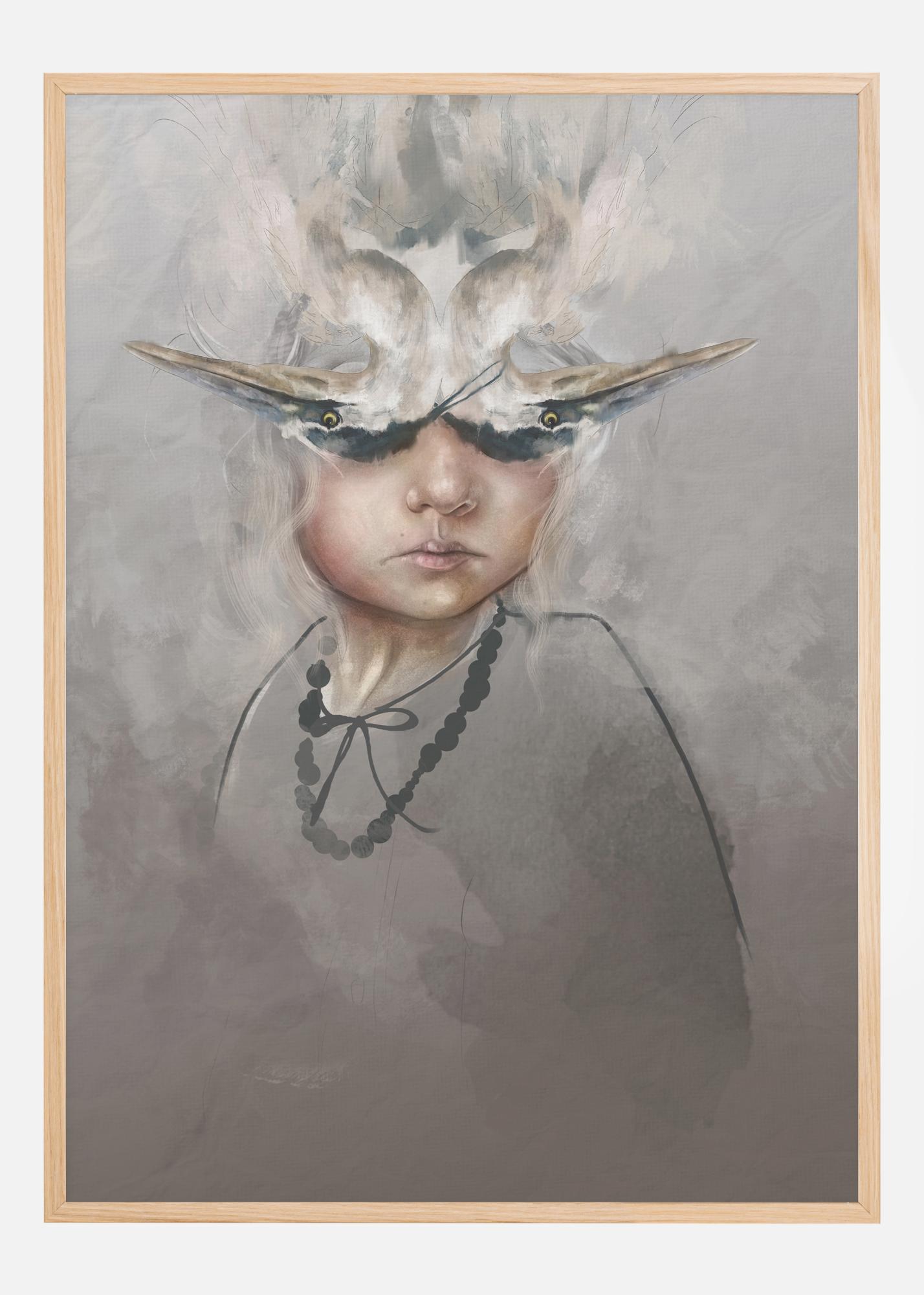 Ein unheimliches Poster einer in Rauch gehüllten Person. Der Kopf ist mit einem Hut bedeckt, der in Flammen zu stehen scheint und wie zwei auf dem Kopf stehende Vögel oder ein Totenkopf aussieht. Die Augen sind auf mysteriöse Weise mit Schirmen bedeckt, während die Figur einen kühlen Kopf bewahrt. Holen Sie sich dieses Kunstwerk in Ihr Haus, um es neu zu interpretieren.