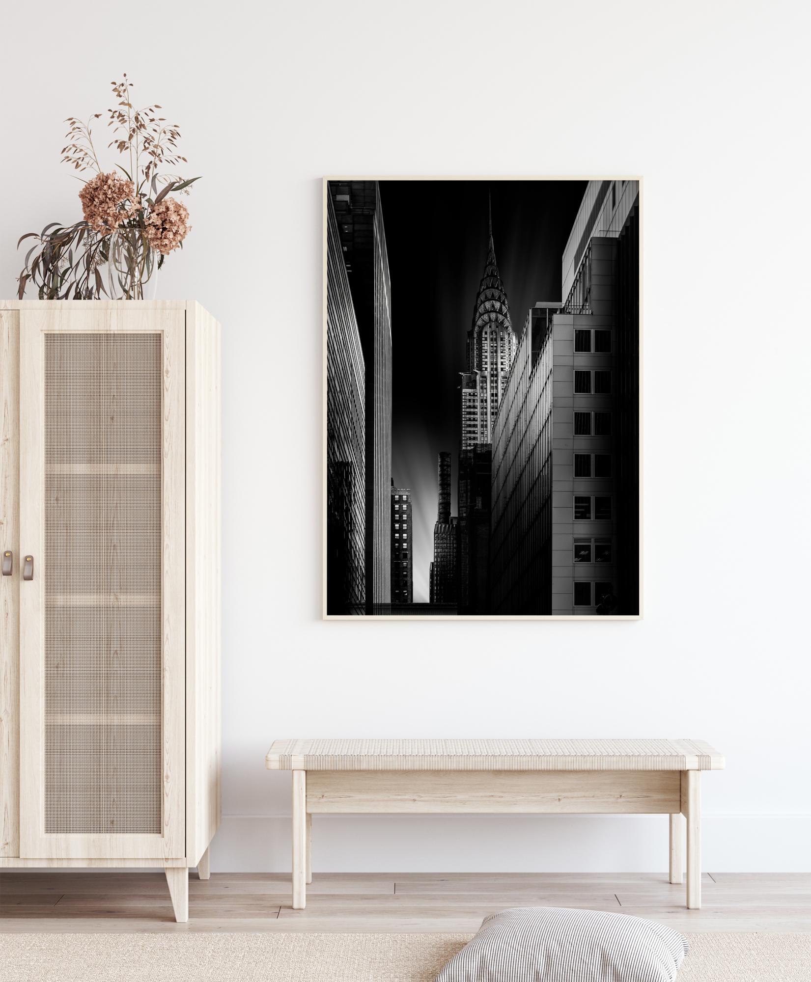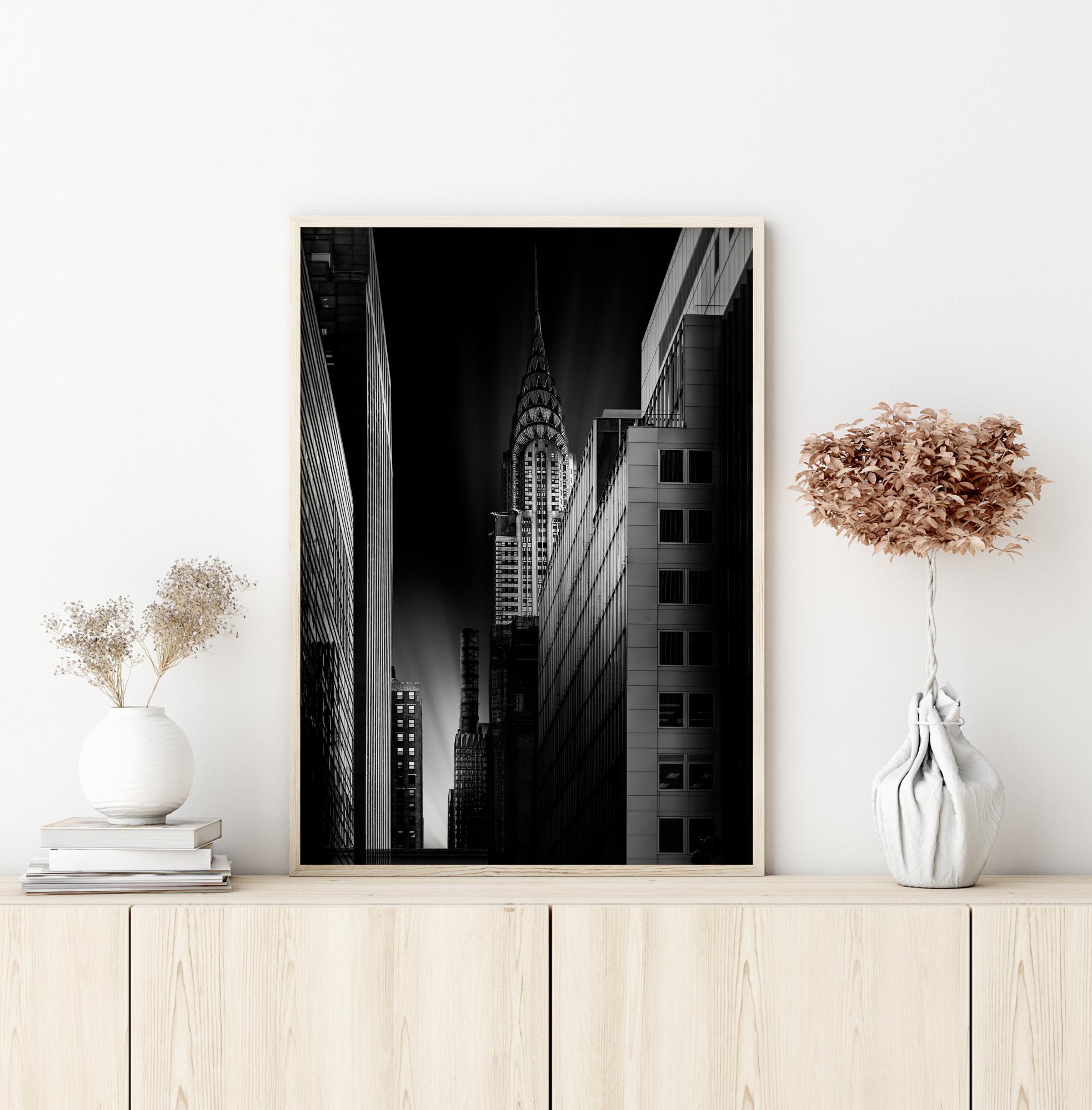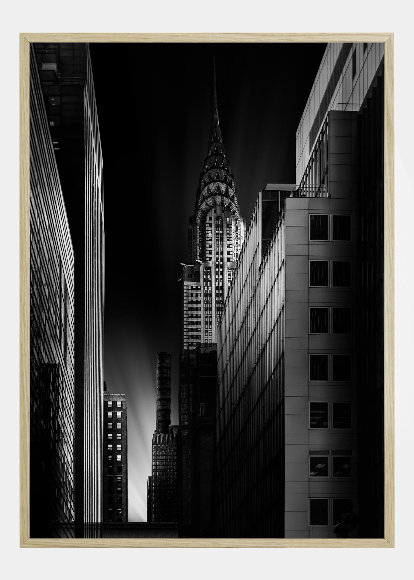 Ein urbanes Poster des Chrysler-Gebäudes bei Nacht. Eine schmale Straße lenkt den Blick auf ein grelles Licht, das den Himmel erhellt. Auf der rechten Seite ist das schattenhafte Chrysler-Gebäude in dieser leicht unheimlichen Aufnahme zu sehen. Hängen Sie es an eine weiße Wand, um das Gefühl einer Kunstgalerie zu vermitteln.