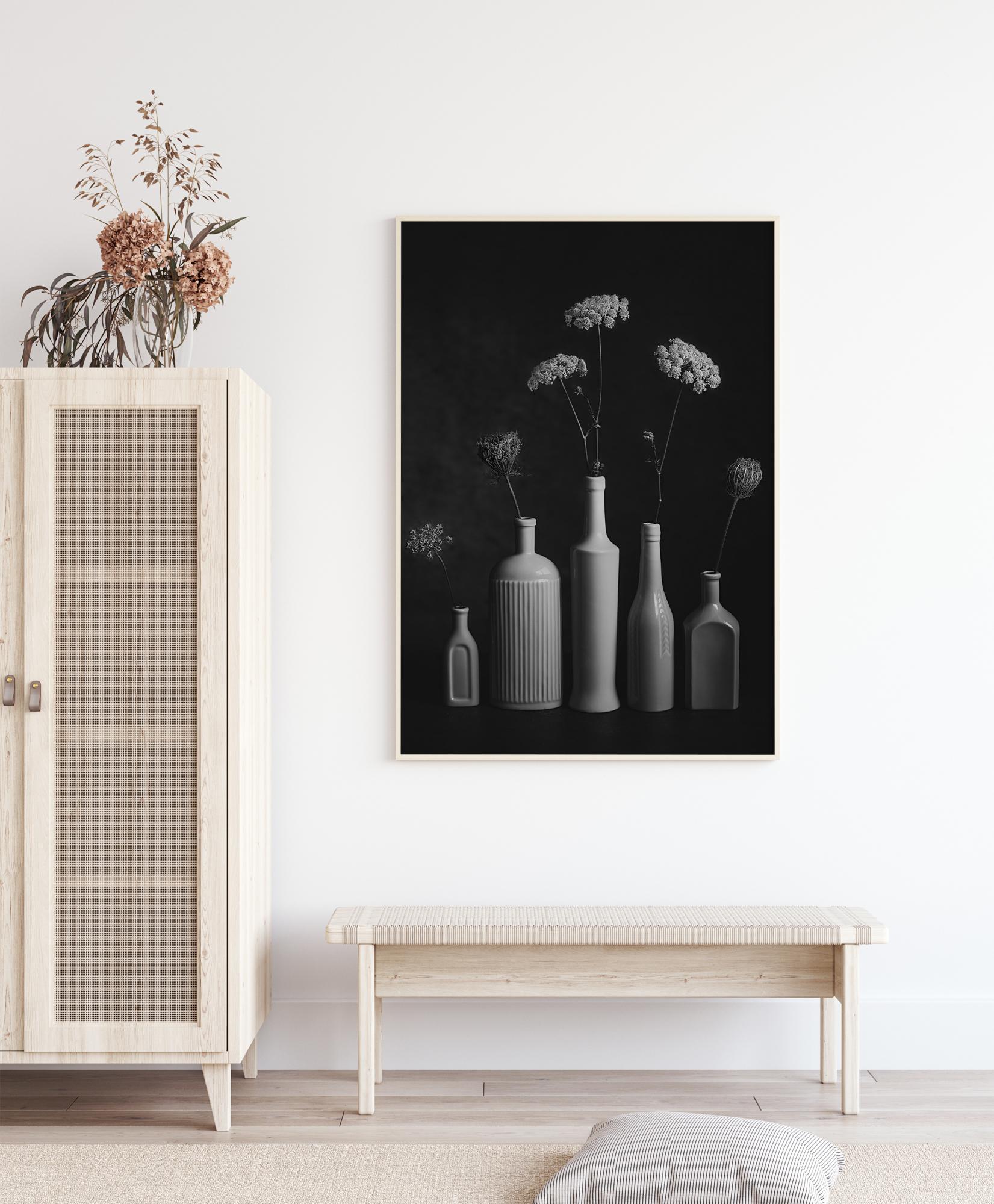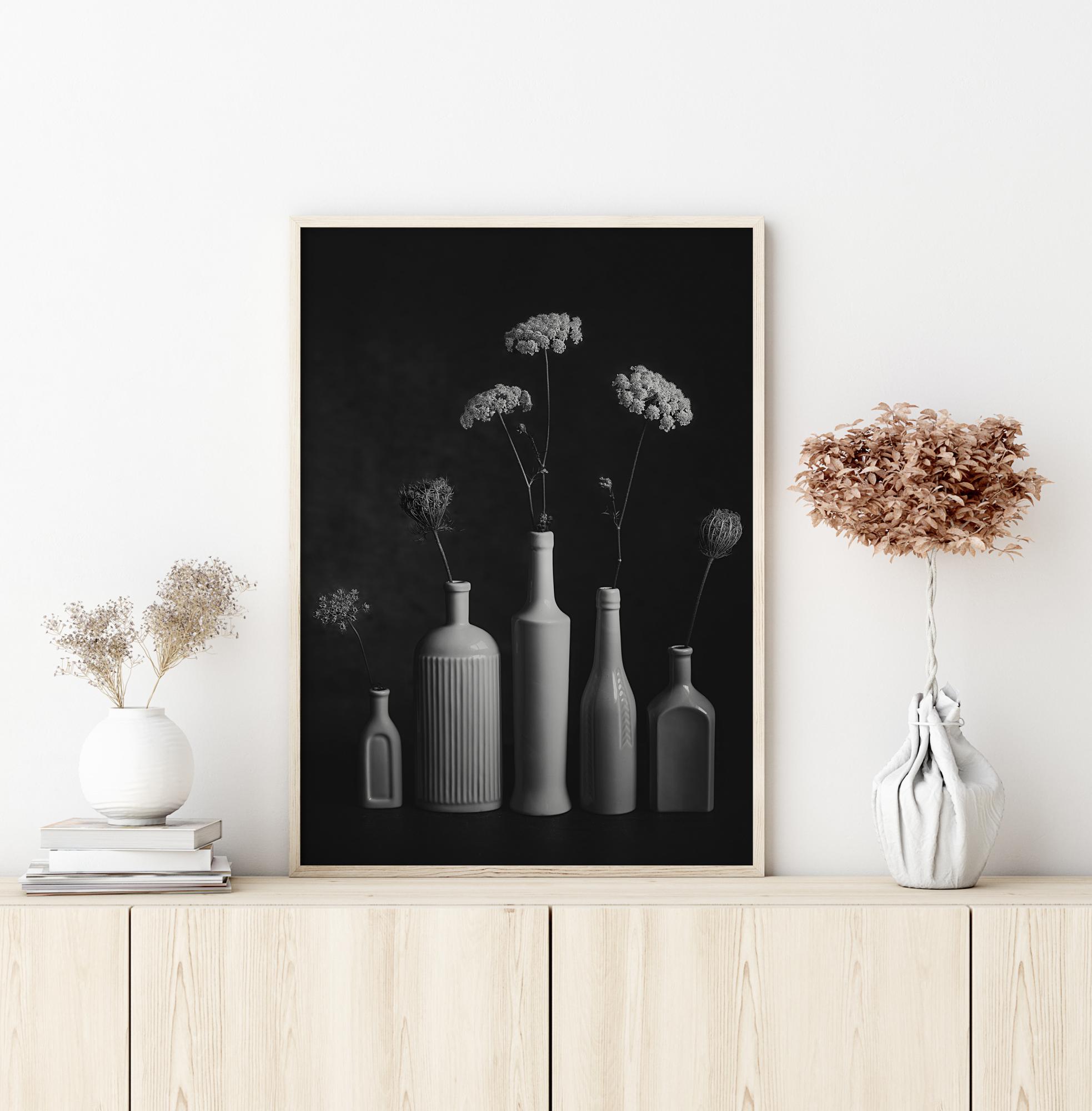 Ein traditionelles Poster mit Flaschen und Blumen vor einem einfachen schwarzen Hintergrund. Bringen Sie einen Hauch von holländischem Malerstil in Ihr Zuhause mit dieser schlichten, aber überzeugenden Komposition aus Flaschen und Blumen.