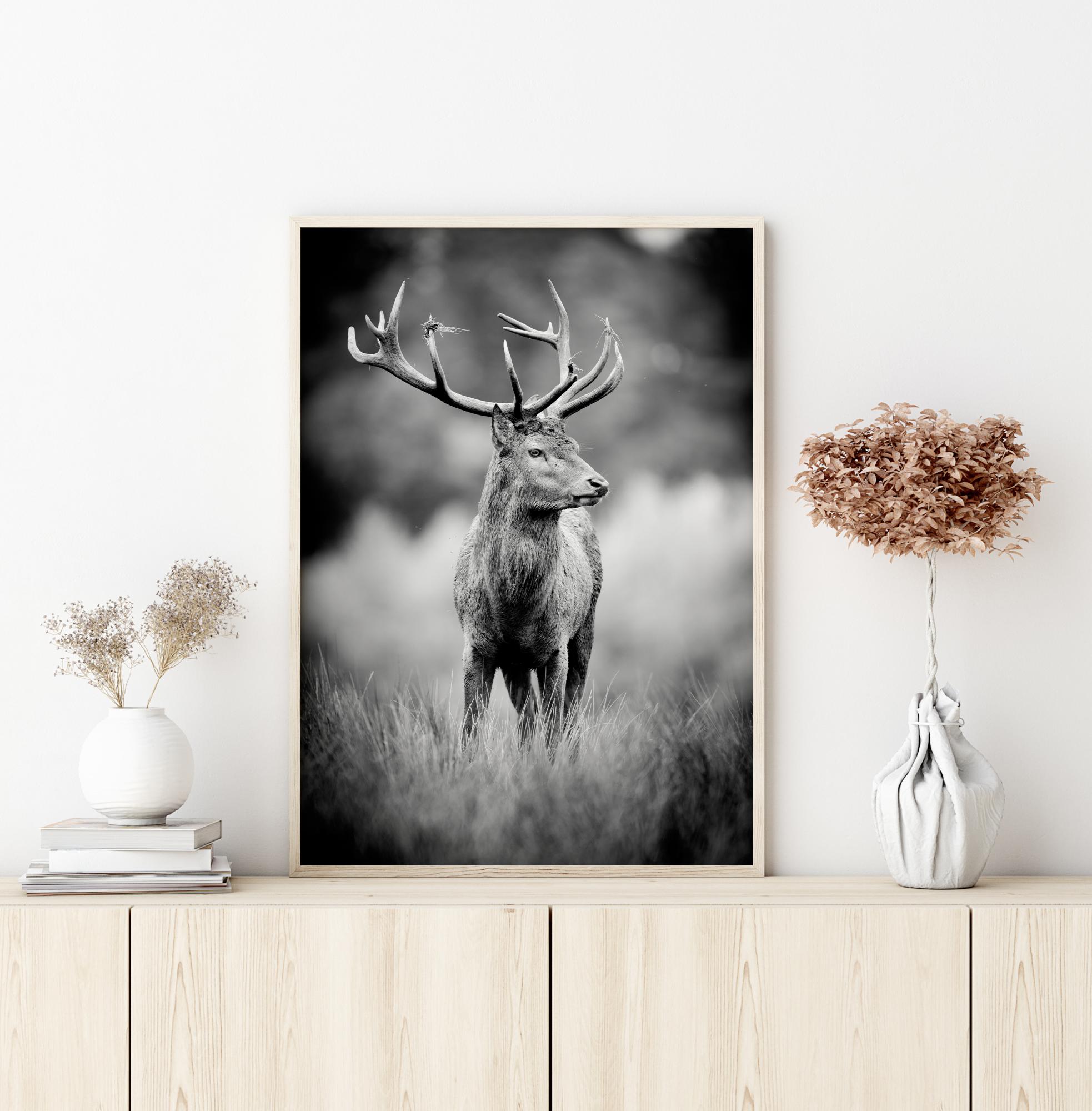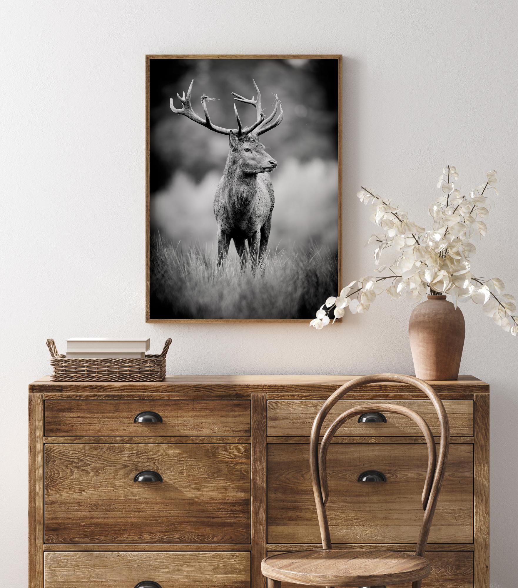 Ein Wildtierposter eines Hirsches mit Geweih in schwarz-weiß. Die Vignette vermittelt den Eindruck, als würden Sie ihn wie in freier Wildbahn durch ein Fernglas betrachten, was diese Szene noch spezieller macht. Sein gedrehter Kopf bedeutet, dass er zu Ihnen zurückblickt und Sie in sich hineinzieht.