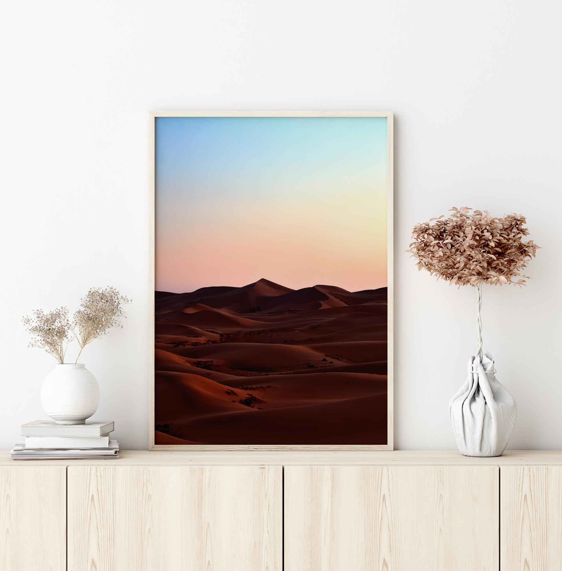 Ein stimmungsvolles Poster einer Wüstenlandschaft. Das tiefe Rot der Wüste trägt dazu bei, dass sich die wellenförmigen Sanddünen heben und senken und Ihr Auge durch die Szene ziehen. Der zartblaue Himmel und die dunstigen Rosatöne tragen dazu bei, die Stimmung des frühen Morgens zu erzeugen. Genießen Sie die weiten Szenen der Natur, wenn Sie dieses Poster mit nach Hause nehmen.