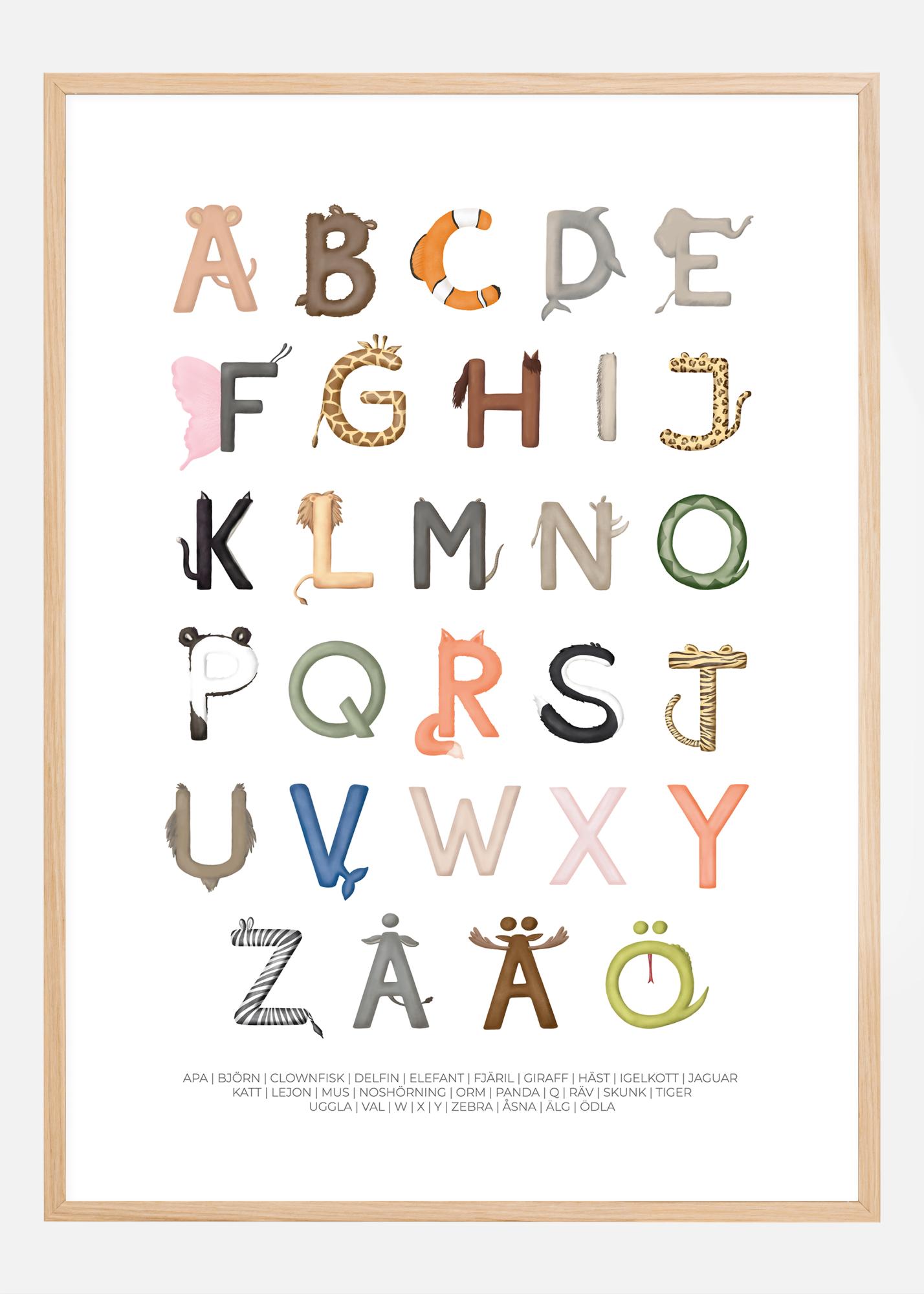 Dieses spielerische und pädagogische Poster ist perfekt, um die Neugier und das Lernen von Kindern zu inspirieren. Es zeigt das Alphabet, dargestellt durch eine Reihe verschiedener Tiere, wobei jeder Buchstabe einzigartig geformt ist, um ein Tier abzubilden, das mit eben diesem Buchstaben beginnt. Von 'A' wie Affe bis 'Ö' wie Eidechse ist jeder Charakter reich illustriert mit einem klaren, freundlichen und farbenfrohen Stil. Es enthält auch die drei zusätzlichen Buchstaben des schwedischen Alphabets: 'Å', 'Ä' und 'Ö', was ein vollständiges sprachliches Erlebnis bietet.