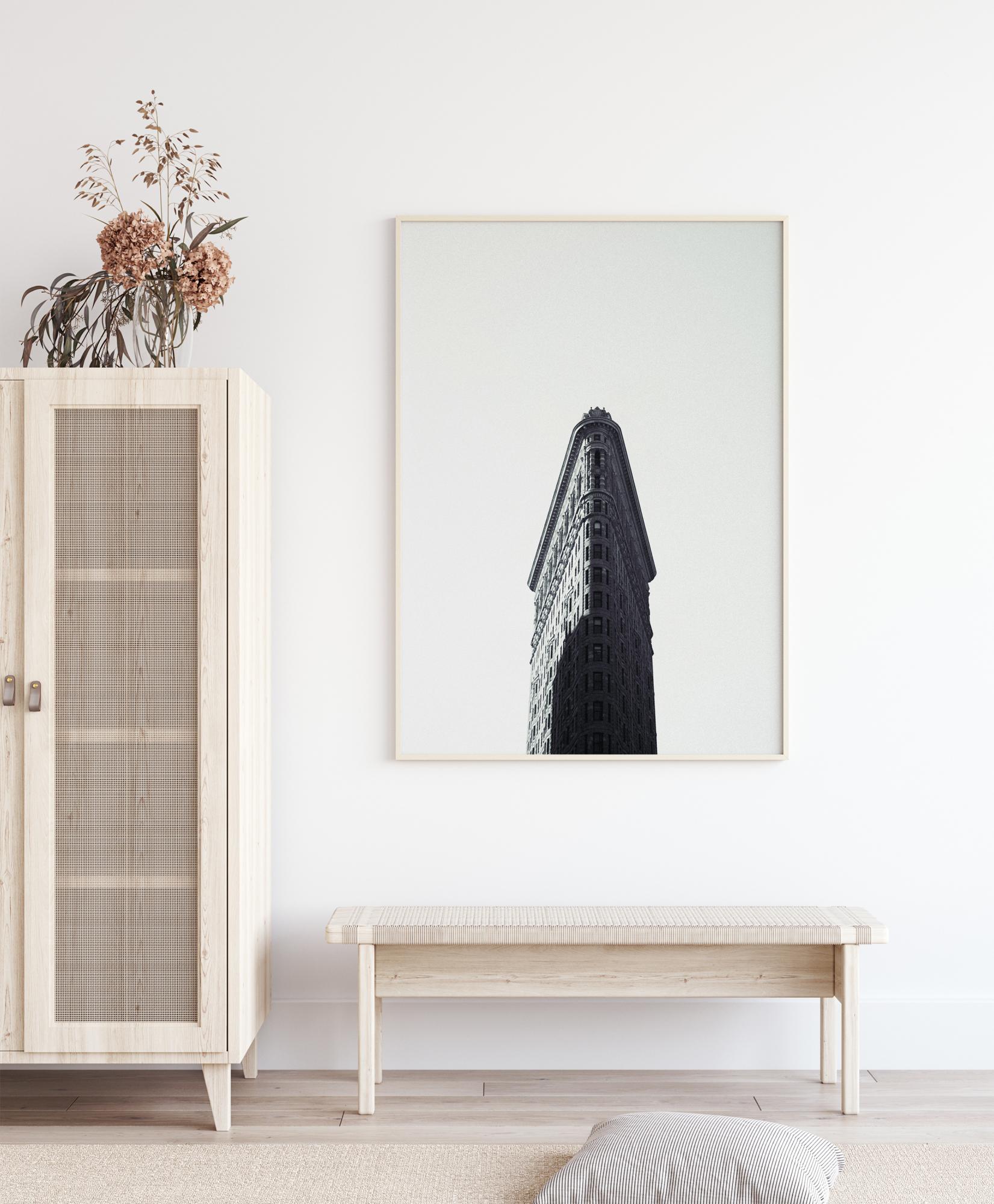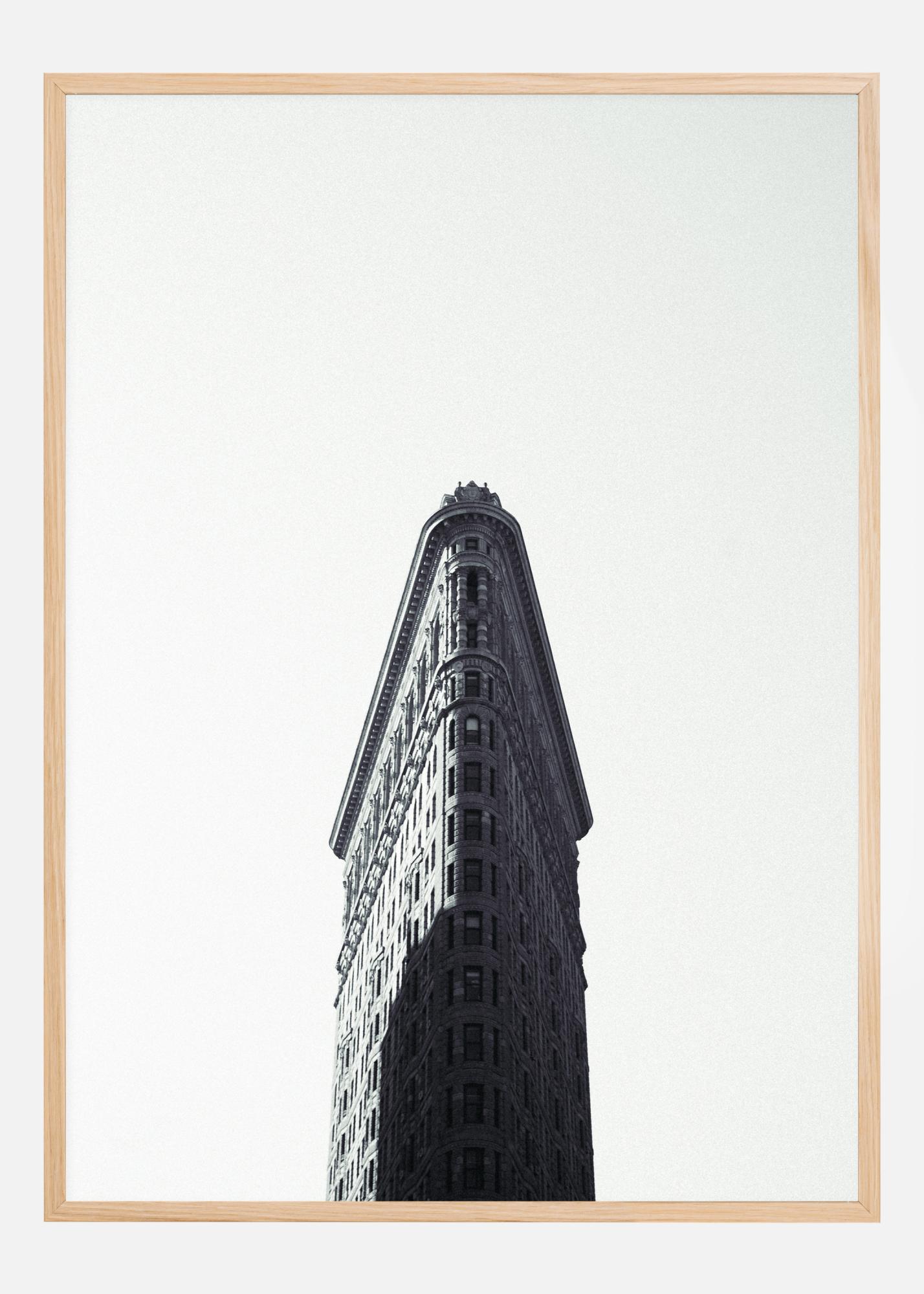 Ein architektonisches Poster, das die vordere Ecke eines alten Wohnblocks zeigt. Die Vorderseite des Gebäudes sieht aus wie der Bug eines Schiffes und hebt sich deutlich von dem schlichten weißen Himmel ab. Die Dreiecksform zieht den Blick nach innen und oben durch das Gebäude. Auf einer blockfarbigen Wand sorgt dieses Motiv für eine künstlerische Atmosphäre.