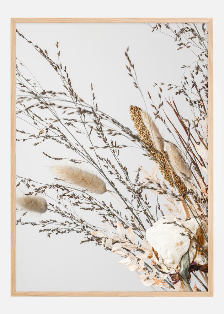 Dieses Poster ist eine Feier der stillen Eleganz der Natur und zeigt ein vielfältiges Arrangement getrockneter Pflanzen. Die natürliche Komposition ist voller feiner Linien und organischer Formen, von den schwankenden Grashalmen bis zu den robusten Ähren und den subtil getönten Blättern. Die braun-beige Palette der getrockneten Pflanzen vor dem reinen weißen Hintergrund vermittelt ein Gefühl von Wärme und Natur, das in Stille eingefangen wird.