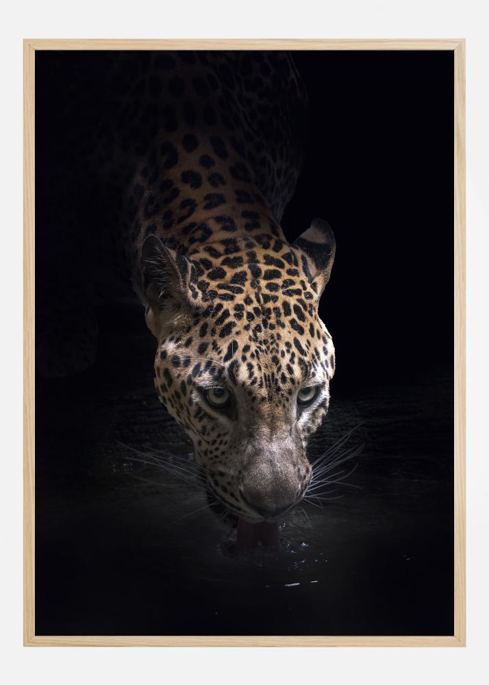 Dieses dramatische Poster fängt einen Leoparden in einem intimen Moment ein, wenn er still Wasser trinkt, ein kraftvoller Augenblick der wilden Natur, der in der Zeit eingefangen wurde. Der schwarze Hintergrund hebt die goldene Farbe des majestätischen Fells und die markanten Flecken hervor, was einen fast dreidimensionalen Effekt erzeugt. Der Leopard ist dem Betrachter zugewandt mit einem Blick voller Konzentration und Anwesenheit eines wilden Tieres, was eine unmittelbare Verbindung zwischen Tier und Mensch schafft.