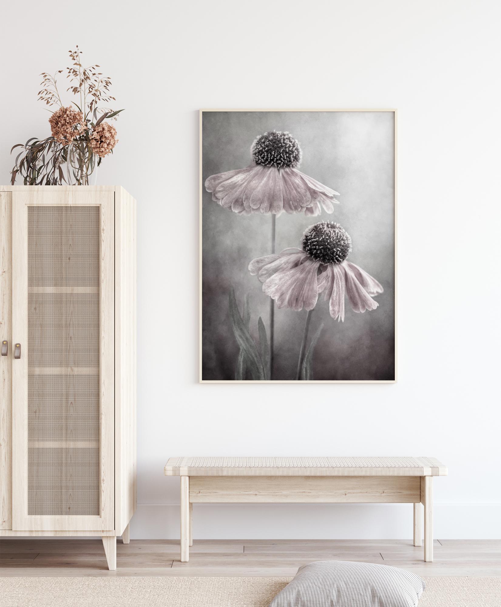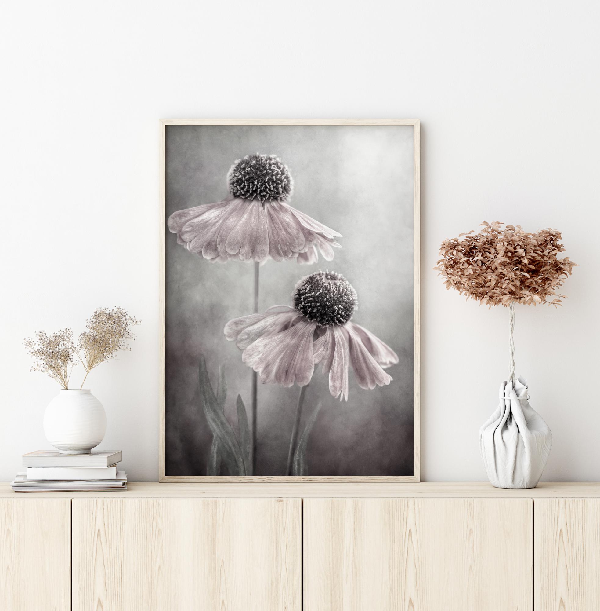 Ein wunderschönes Poster von zwei Gänseblümchen, die sich in den Himmel recken. Die weißen Blütenblätter der beiden Gänseblümchen fallen um die kugelförmige Blütenmitte herum herab. Der Hintergrund ist in einem nebligen Grauton gehalten, durch den das Licht hindurchscheint und für eine stimmungsvolle Atmosphäre sorgt. Spüren Sie die Magie dieses zarten Posters, wenn Sie es in einem Schlafzimmer aufhängen.