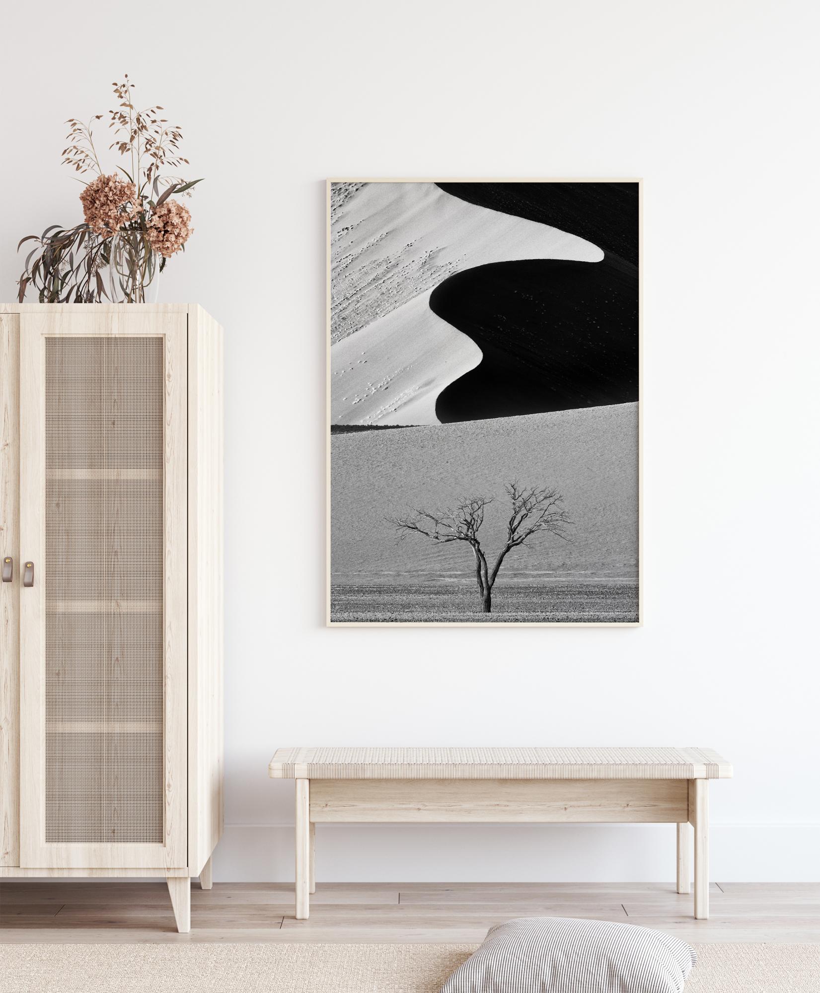Ein dramatisches Poster mit geschwungenen Dünen und einem einsamen Baum. Dieses starke Bild stellt die schwarz-weißen Kurven der Düne der statischen Stille des Baumes gegenüber. Schaffen Sie eine Atmosphäre der Ehrfurcht mit diesem Werk.
