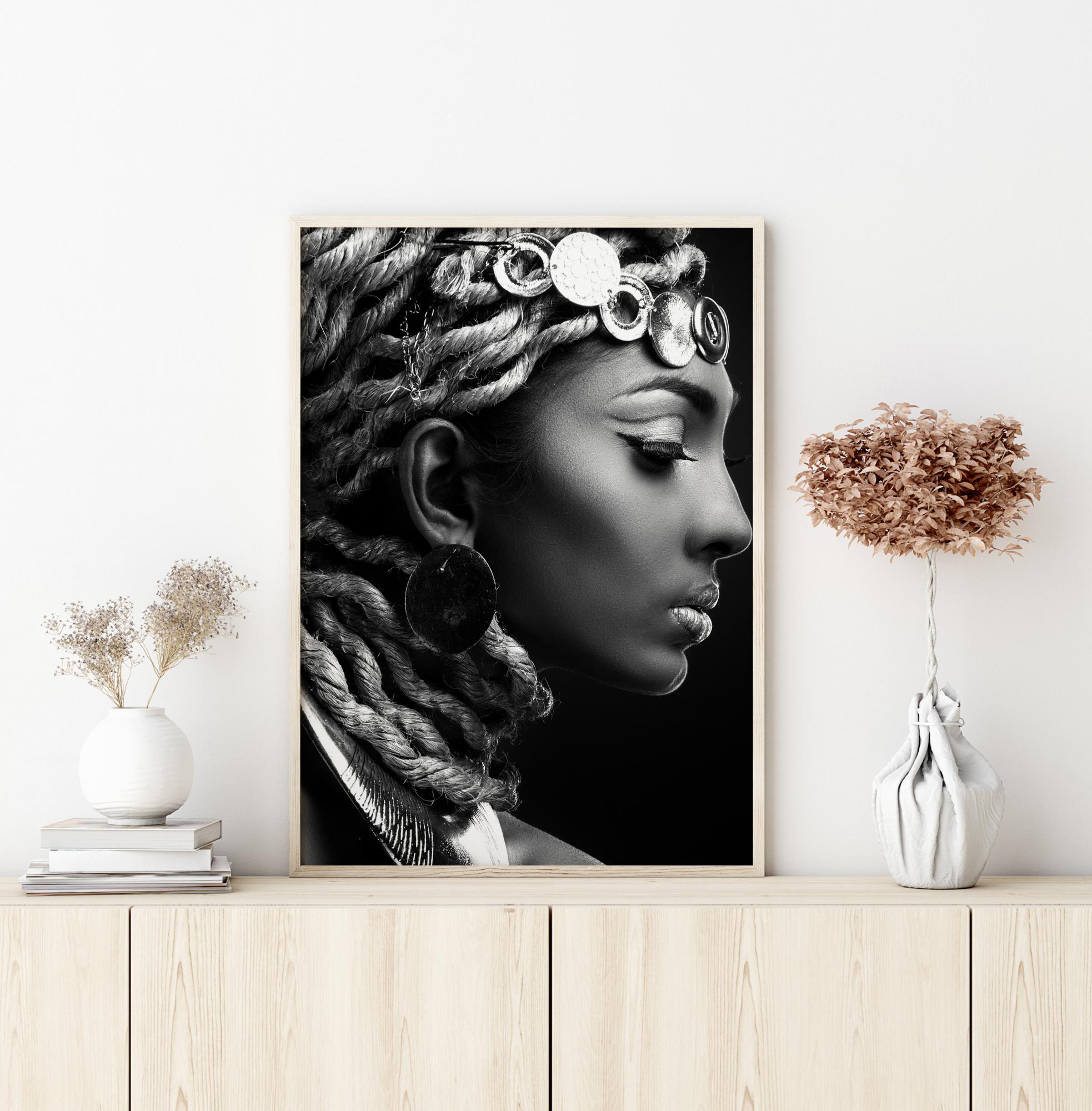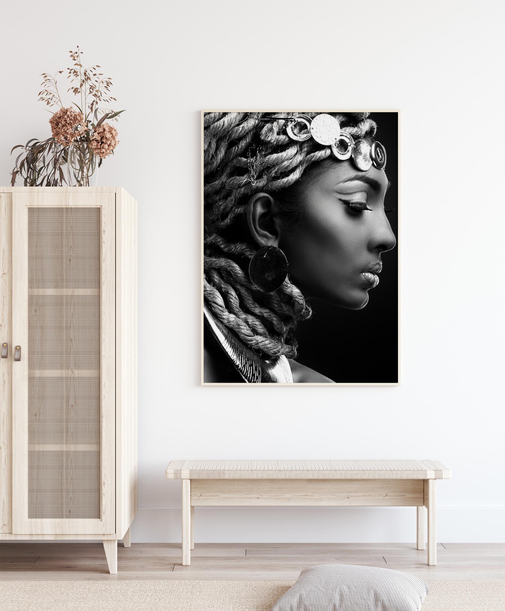Ein atemberaubendes Porträtposter mit dem Profil einer Frau, die sich im altägyptischen Stil kleidet. Dieses Schwarz-Weiß-Bild erzeugt ein Gefühl der Dramatik, da diese schöne Frau gebieterisch nach unten schaut. Ihr Kopf, ihre Ohren und ihr Hals sind mit großem Goldschmuck geschmückt, einem Symbol für Reichtum. Lassen Sie sich jeden Tag von dieser starken Frau inspirieren.