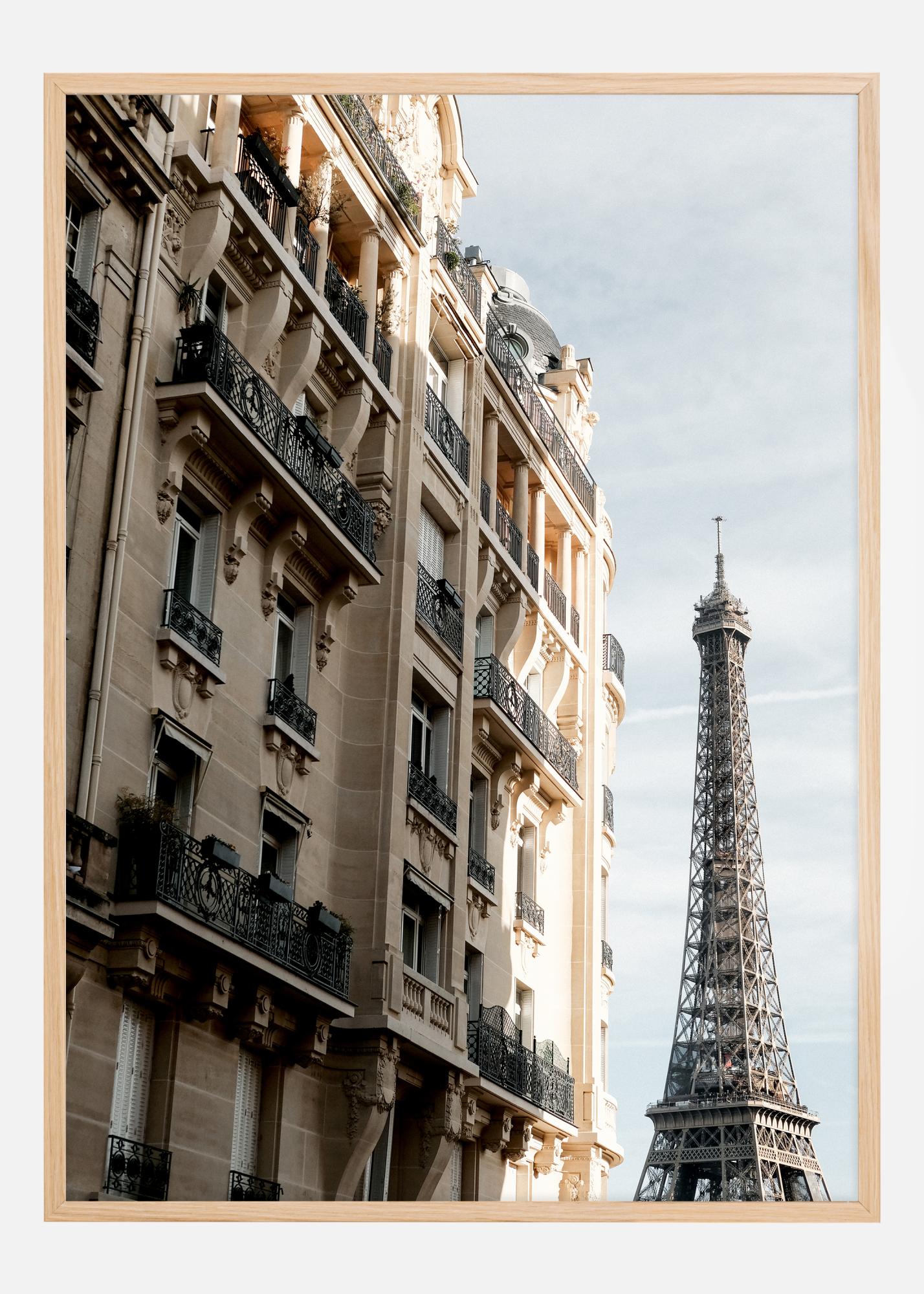 Dieses Poster zeigt einen klassischen Blick auf Paris, wo sich der Eiffelturm stolz hinter den typischen Wohnhäusern der Stadt mit ihren schmiedeeisernen Balkonen und skulpturalen Fassadendetails erhebt. Es ist eine Szene, die eine pariserische Atmosphäre und Eleganz ausstrahlt, perfekt, um jedem Zuhause einen Hauch französischen Flairs zu verleihen. Das Bild fängt die perfekte Balance zwischen den architektonischen Juwelen der Stadt und dem offenen Himmelsspace ein, was ein Gefühl von Weite und Freiheit vermittelt, das synonym mit der Seele von Paris ist.
