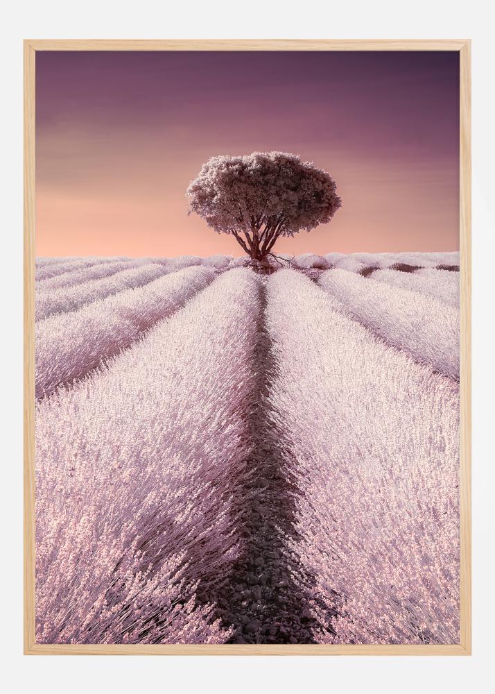 Treten Sie ein in eine Traumwelt aus Farbe und Fantasie mit unserem exklusiven Poster. Dieser Print strahlt ein magisches Gefühl aus mit seinem pastellfarbenen Himmel, der von warmem Rosa zu beruhigenden lila Nuancen übergeht. Das Motiv hebt einen einzelnen Baum hervor, majestätisch zentriert entlang der klaren Linie eines Lavendelfeld-Weges. Dieses Poster ist ein visuelles Fest für die Augen und würde perfekt als Mittelpunkt in jedem Raum passen, und verleiht eine Note von Ruhe und Schönheit.