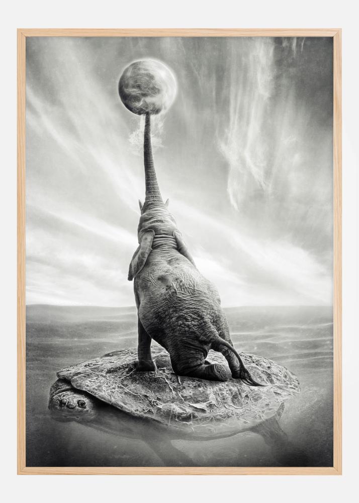 Dieses faszinierende schwarz-weiße Poster erfasst ein surreales Bild eines Elefanten, der auf einer Schildkröte steht und einen Globus auf seinem Rüssel balanciert. Das Bild strahlt eine kraftvolle Symbolik aus und spielt mit Elementen der Mythologie und Fantasie. Die texturierte Haut des Elefanten und der Schildkröte, detailliert und hervorstechend, verleiht dem Werk eine fast taktile Dimension, während der verschwommene Hintergrund aus Wolken und Landschaft zu einer traumhaften und ätherischen Atmosphäre beiträgt.