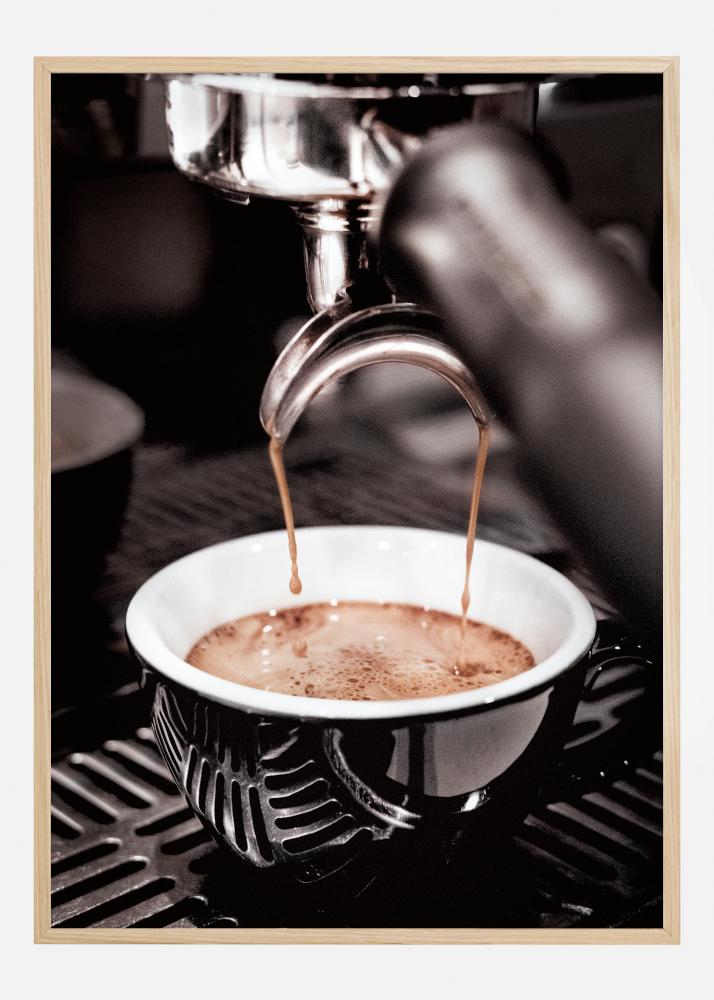 Dieses Poster fängt einen fast sinnlichen Moment eines perfekt gebrühten Espressos ein, wo die goldbraunen Tropfen Kaffee der schneeweißen Tasse in einem intimen Tanz begegnen. Es ist eine Ode an Kaffeeliebhaber und Kenner, ein Bild, das sowohl das reichhaltige Aroma als auch den starken Geschmack, den Espresso bietet, vermittelt. Der selektive Fokus auf den Kaffeestrom und die Tasse darunter, vor dem unscharfen Hintergrund der Espressomaschine, erzeugt einen Effekt, der es dem Betrachter ermöglicht, fast die Wärme zu spüren und das Zischen des Dampfes zu hören.