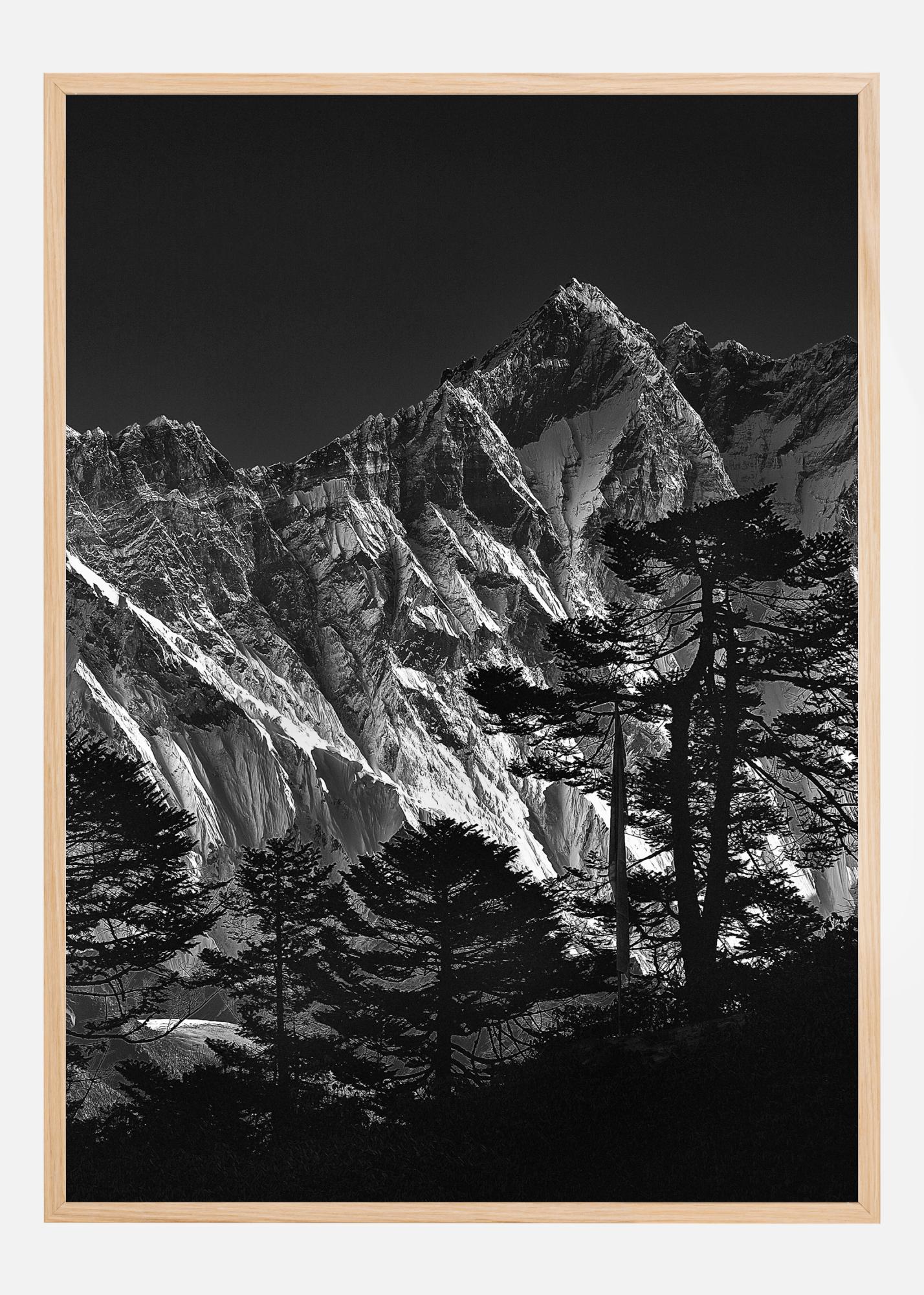 Ein Bergposter, das die Seite des Mount Everest zeigt. Dieses dramatische Schwarz-Weiß-Foto zeigt die steilen Hänge des Berges in strahlendem Weiß. Im Vordergrund sind dunkle Bäume zu sehen, während der Berg im Hintergrund von einem dunklen Himmel umgeben ist. Spüren Sie die Dramatik und die Gefahr in diesem Bild.