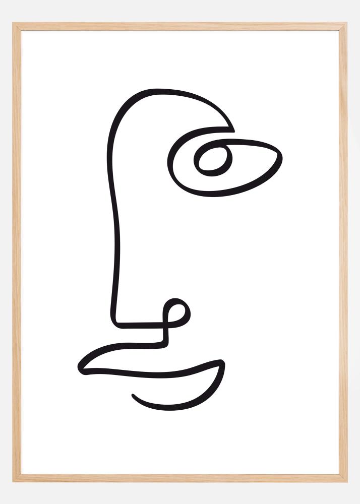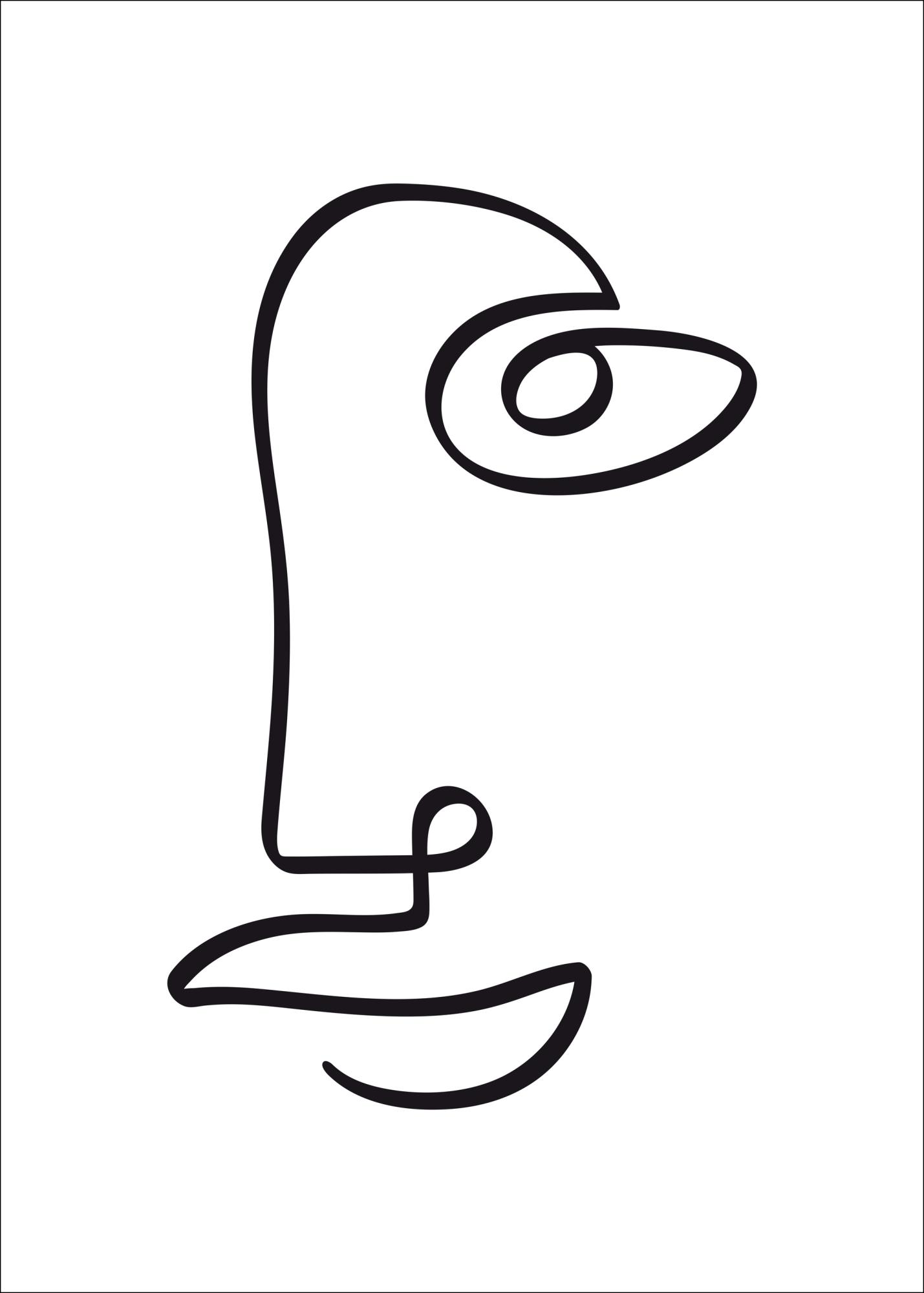 Ein abstraktes Poster mit einem Gesicht mit schwarzen Linien. Die einfache schwarze Linie schlängelt sich um das Blatt und bildet eine Seite eines Gesichts, ohne das Papier zu verlassen. Betrachten Sie dieses einfache Bild, wenn Sie es zu Hause aufhängen, und entdecken Sie sogar andere Bilder, die sich darin verbergen.