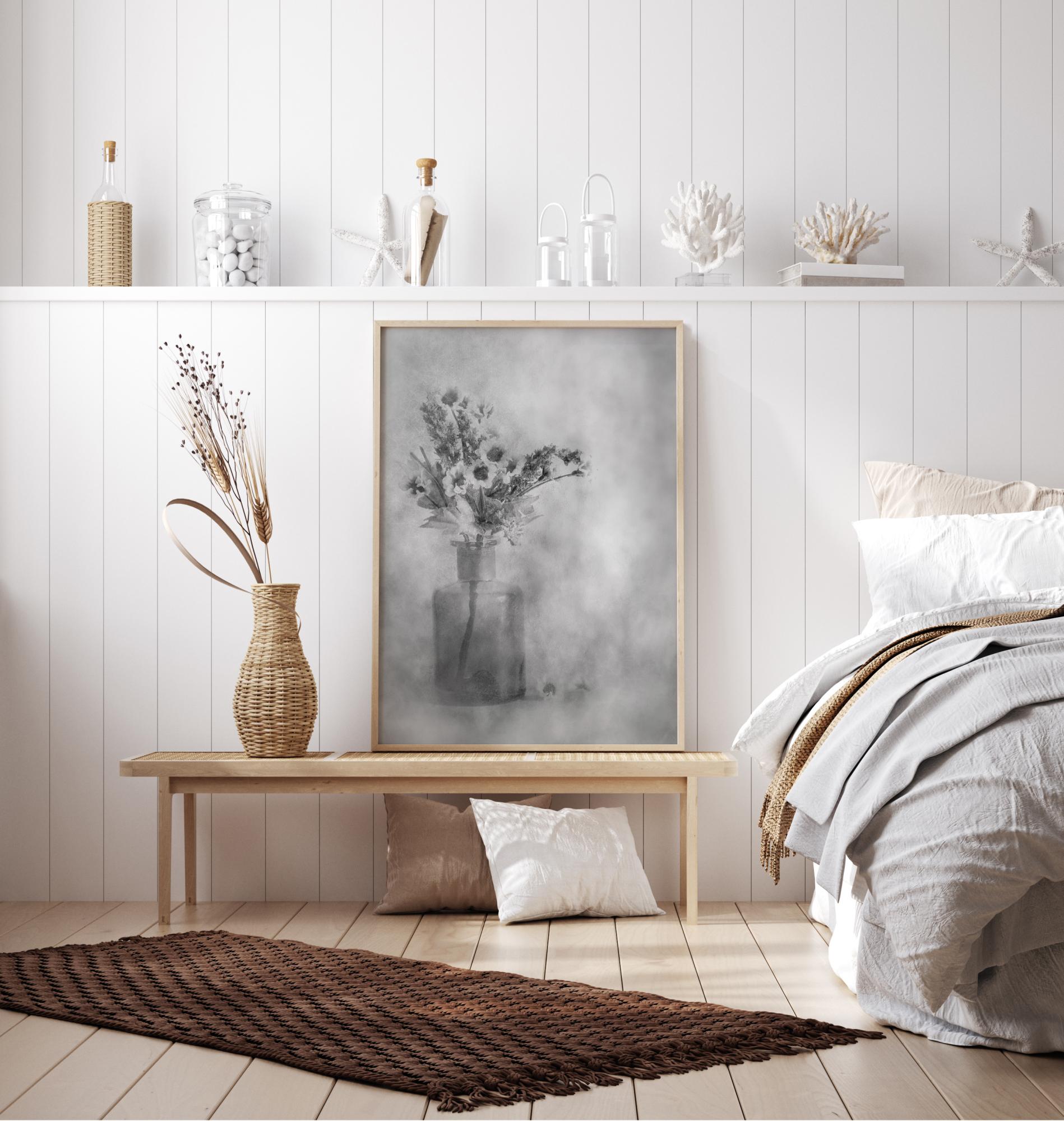 Ein romantisches Poster eines sanften Stilllebens mit einer Vase und Blumen. Dieses in Grautönen gehaltene Werk hat eine sanfte malerische Note mit minimalem Kontrast zwischen den verschiedenen Elementen im Bild. Stellen Sie sich vor, wie Sie sich zum Malen dieser ruhigen Szene niederlassen, wenn Sie dieses Poster zu Hause an eine pastellfarbene Wand hängen.