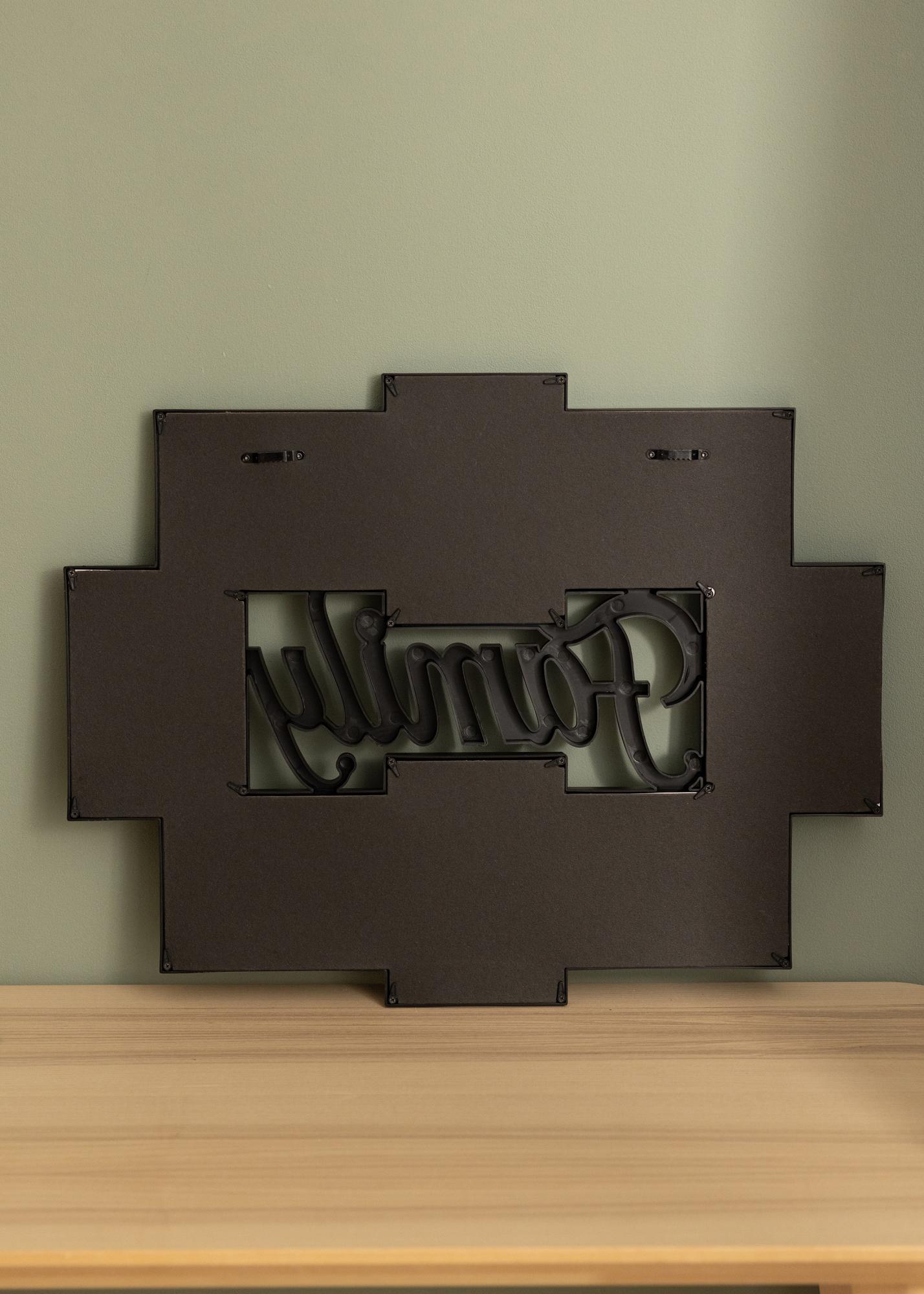 Hängen Sie Fotos der ganzen Familie in einem stilvollen Collagerahmen auf! Dieser schwarze Rahmen fasst 8 Bilder im Format 10x15 cm, die um den ausgeschnittenen Text „Family“ in der Mitte des Rahmens platziert werden. Es gibt Platz für Fotos in sowohl Hoch- als auch Querformat, sodass Sie flexibler sein können, wenn Sie entscheiden, welche Motive Sie in den Rahmen einsetzen. Um Ihre Bilder in den Collagerahmen einzusetzen, lösen Sie die Rückseite des Rahmens mit Hilfe von drehbaren Clips, um dann Ihre Fotos einfach dort zu platzieren, wo Sie sie haben möchten.