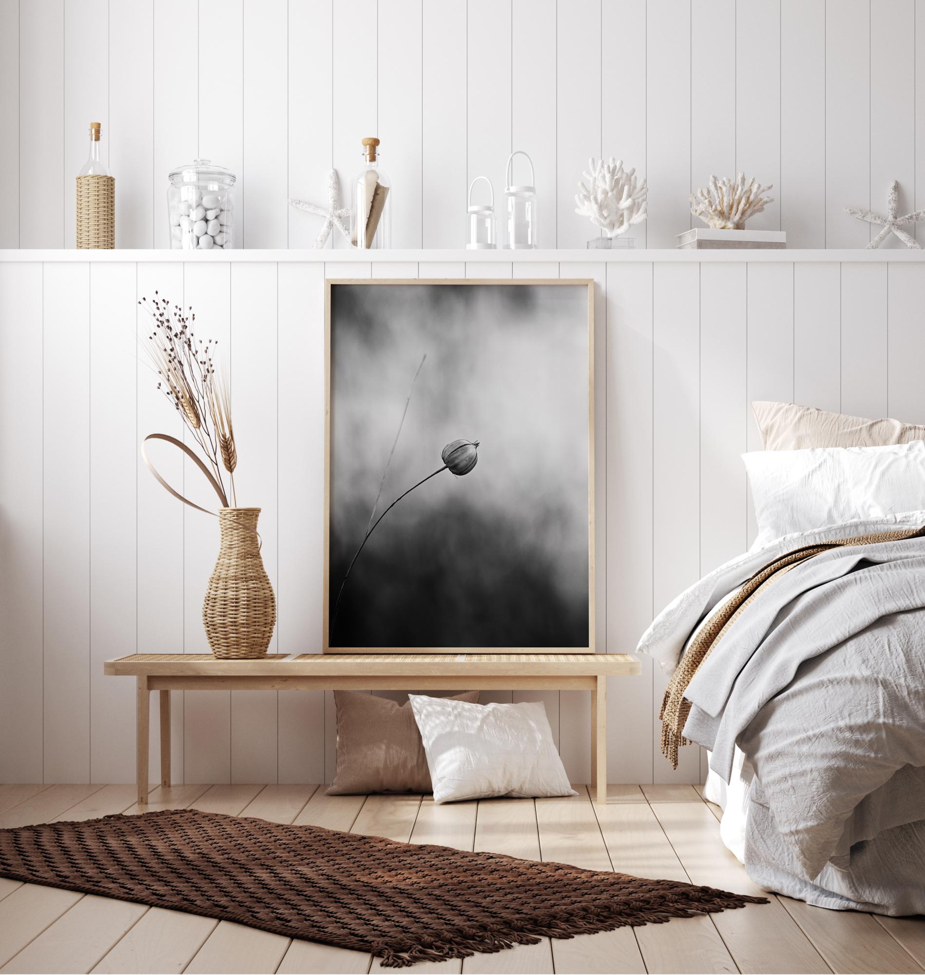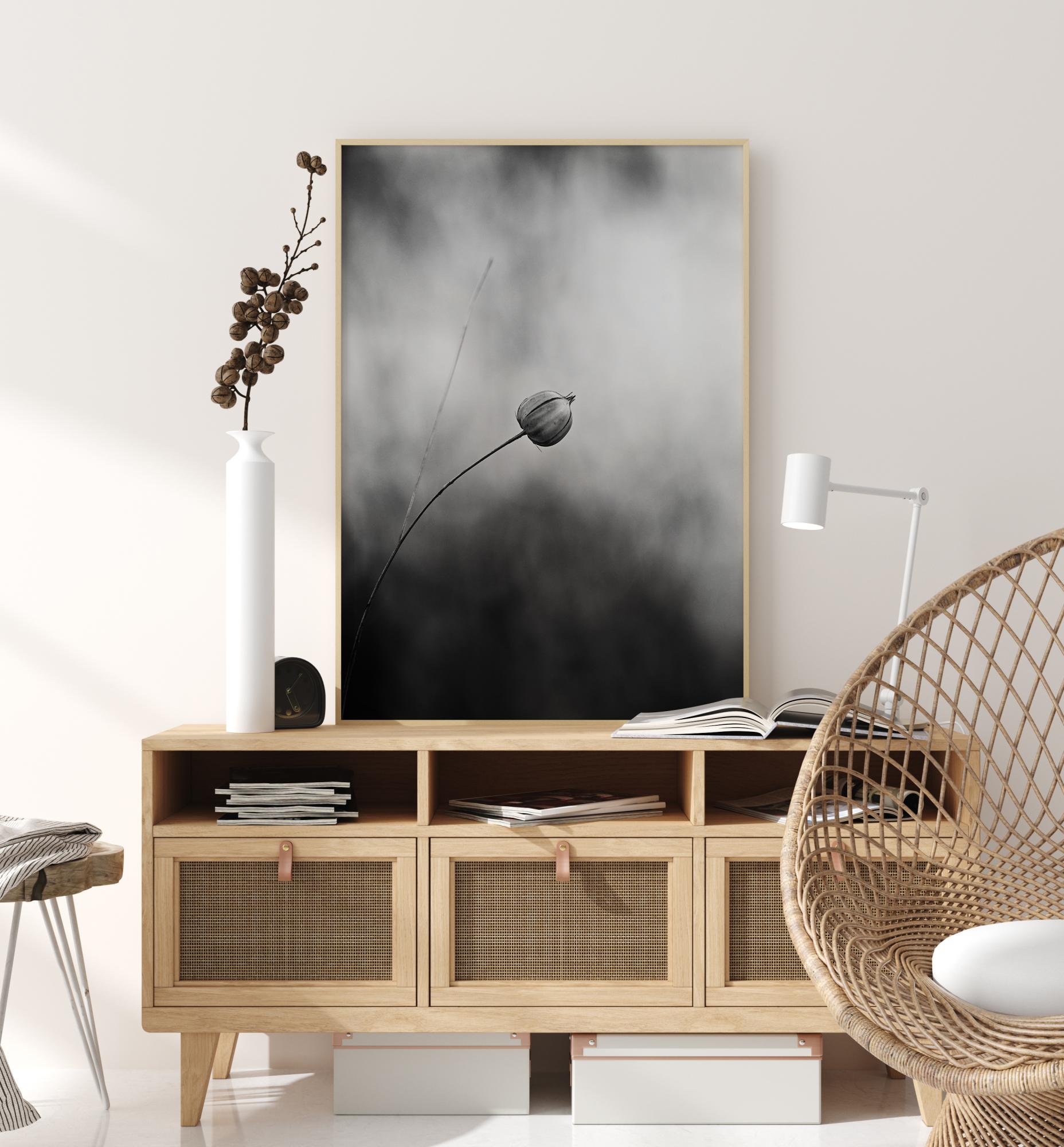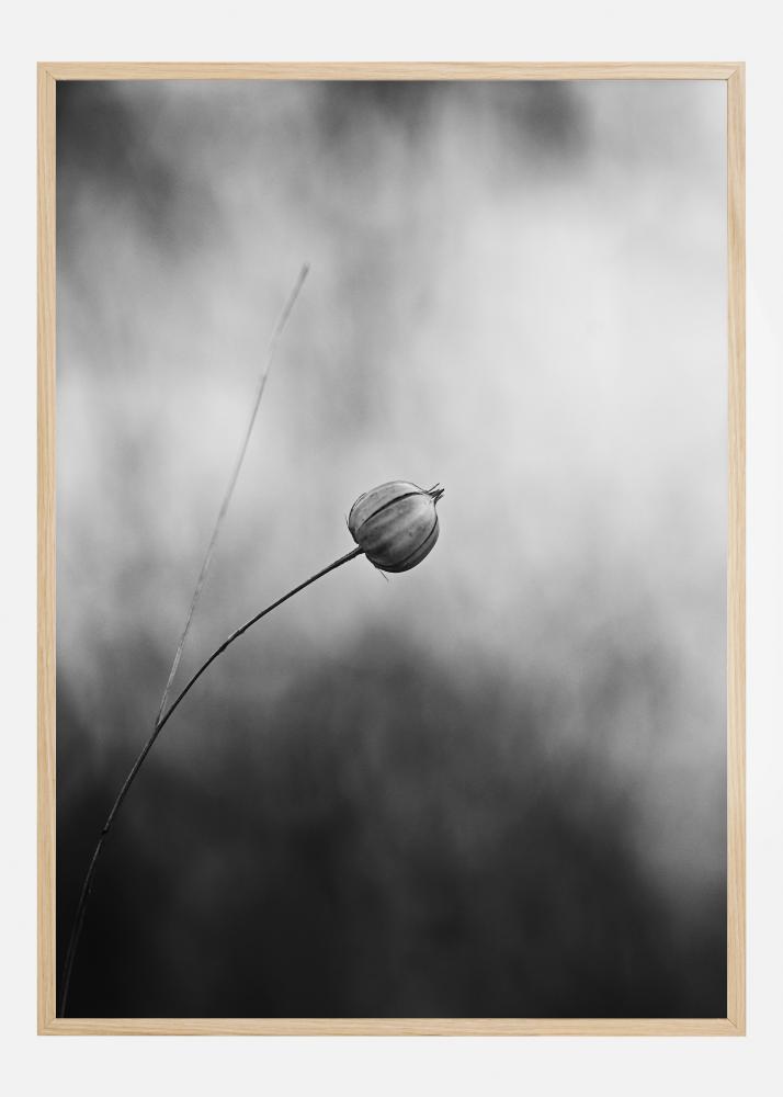 Ein Schwarz-Weiß-Poster mit einer einzelnen Flachspflanze nach der Blüte. Der Flachs biegt sich in die Mitte des Bildes und wird durch das weiße Licht hervorgehoben. Darunter ist der Hintergrund dunkel und unscharf, um die Aufmerksamkeit auf die einzelne Blume zu lenken. Bringen Sie Farbe in dieses Bild auf einer blockfarbigen Wand.