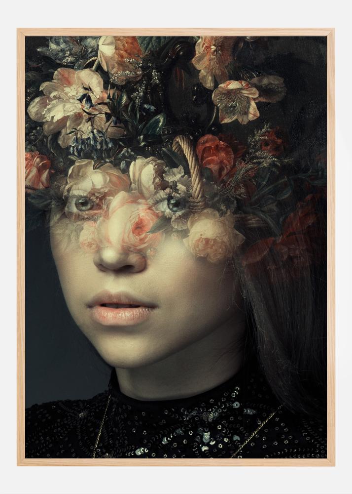 Dieses bezaubernde Poster vereint die Schönheit des menschlichen Porträts mit der unberührten Ästhetik der Natur. Das Werk zeigt eine Frau, deren Gesicht teilweise von einem reichen Blumenarrangement verdeckt wird, was einen mystischen und fast traumhaften Effekt erzeugt. Dieses Kunstwerk mit seinem blühenden Kranz und der sanften, naturalistischen Farbpalette strahlt eine zeitlose Eleganz und künstlerische Finesse aus.
