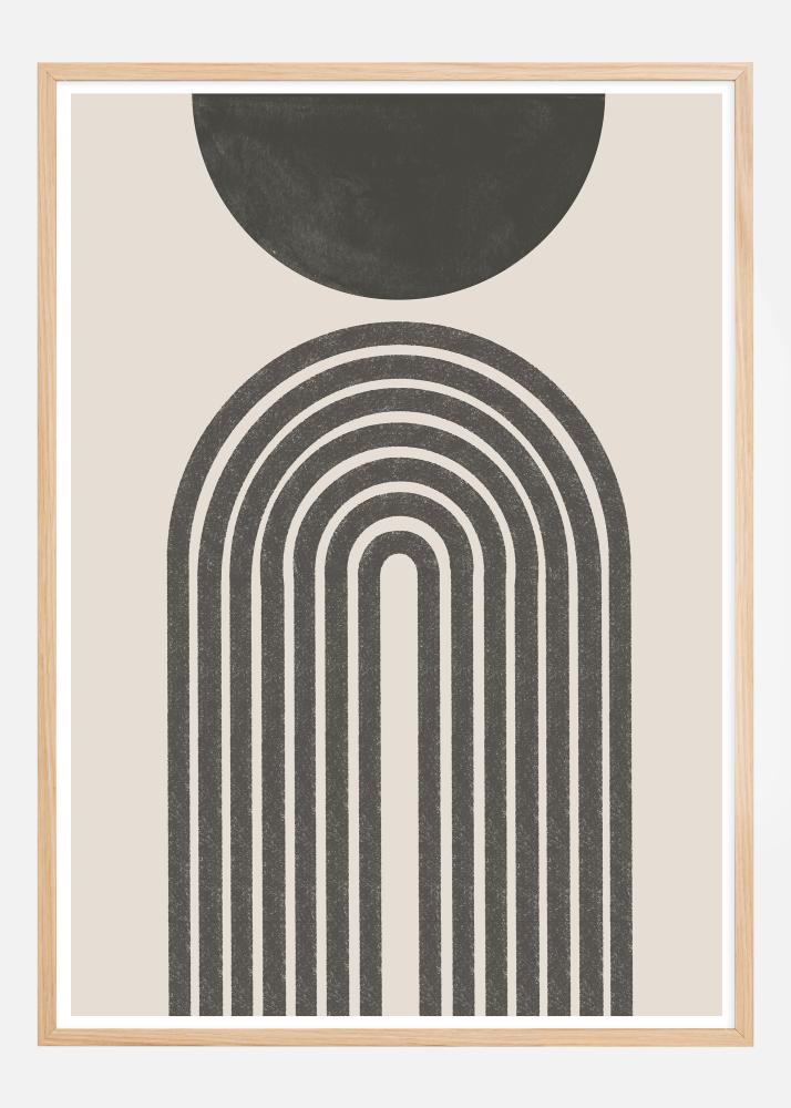 Dieses künstlerische Poster zeigt eine Verschmelzung von geometrischer Präzision und organischer Weichheit. Der obere Teil des Designs besteht aus einem schwarzen Halbkreis, der eine beruhigende Präsenz vor dem warmen, neutralen Hintergrund ausstrahlt. Darunter erhebt sich eine Reihe schwarzer Bögen, die harmonisch eine portallähnliche Form bilden und einen Kontrast zwischen der strengen Geometrie und den abstrakten Kurven des schwarzen Kreises schaffen. Die einfache Farbgestaltung mit Schwarz auf einem off-white Hintergrund vermittelt einen modernen und eleganten Eindruck, perfekt für das zeitgenössische Zuhause oder Büro.